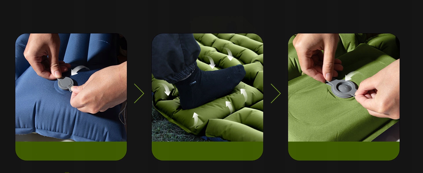 Чтобы полностью налить коврик для кемпинга, требуется всего 30-60 секунд, что удобно и просто, не нужно надувать рот, руку или носить насос, просто накачайте, за 1 секунду можно быстро слить. Кроме того, большой клапан в подушке обеспечивает защиту от надувания и утечки. закрыто неплотно