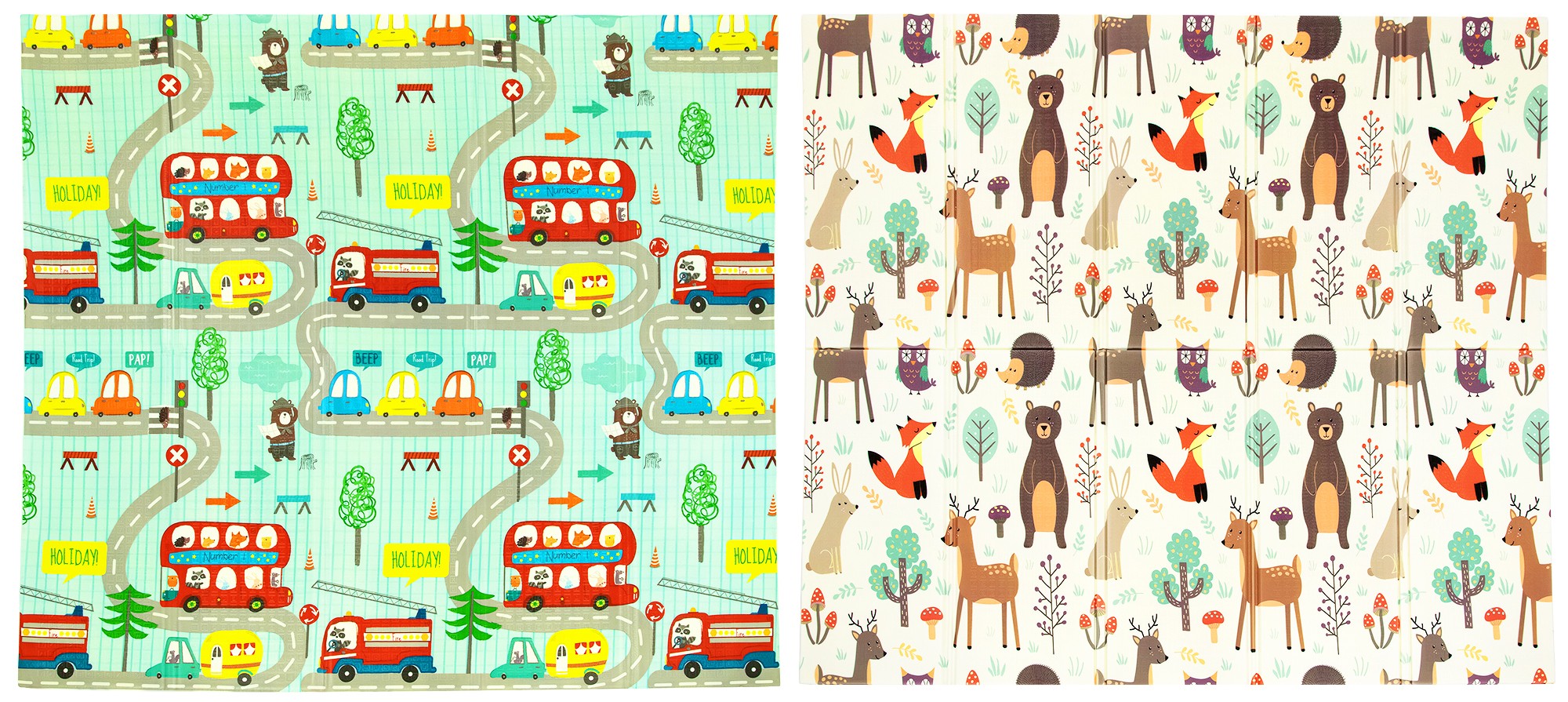 Коврик имеет двухсторонний принт с интересными для детей картинками.