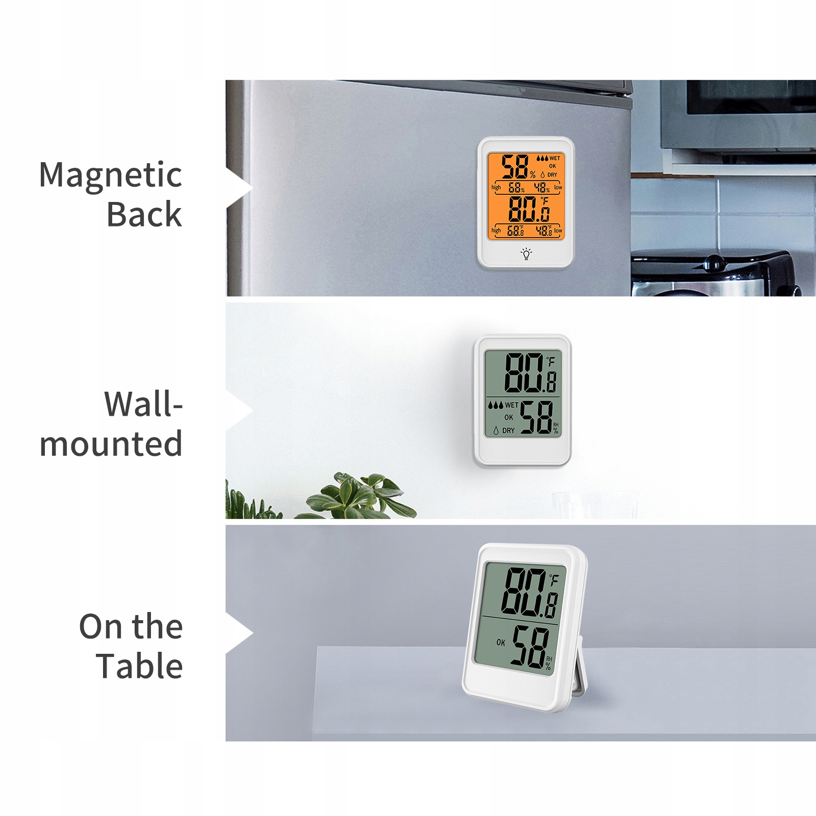 3. [3 способа установки] Цифровой гигрометр с магнитным креплением, возможностью размещения на столе и отверстием для подвешивания на стену можно разместить где угодно.