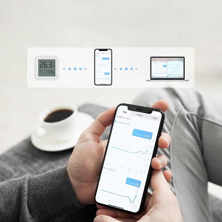 Многофункциональный интеллектуальный термометр. В приложении Smart Life, используемом вместе с Bluetooth-шлюзом Tuya, можно осуществлять удаленный мониторинг, сигнализацию о температуре и влажности, интеллектуальное соединение, связанную Alexa и другие интеллектуальные функции.
