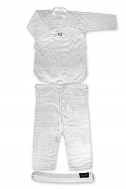Комплект для тхэквондо, состоящий из толстовки, брюк и белого пояса.