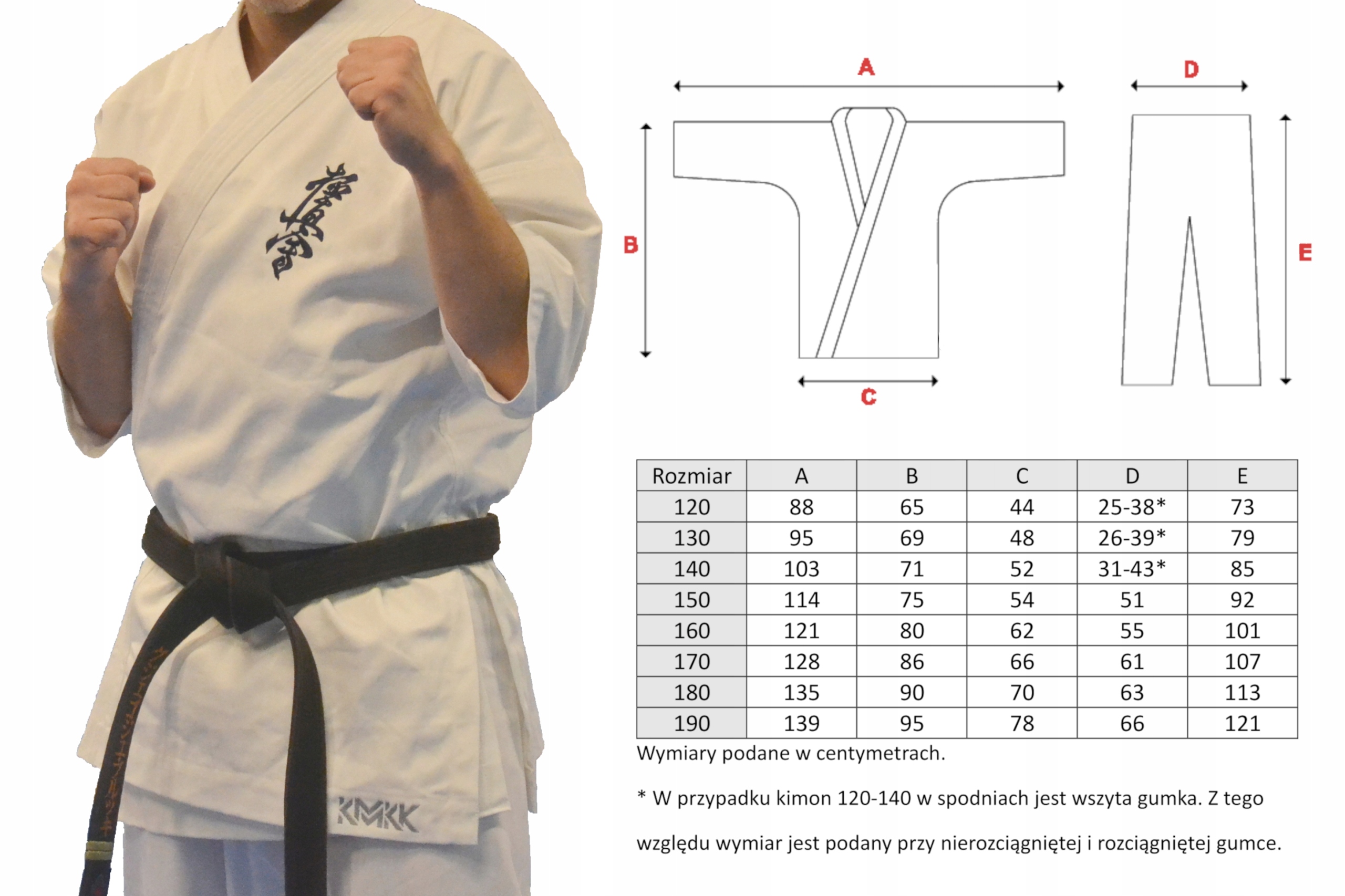 Кимоно в размерах от 120 до 140 см с упругими и ремнями, от 150 до 190 см только с традиционной Трака.