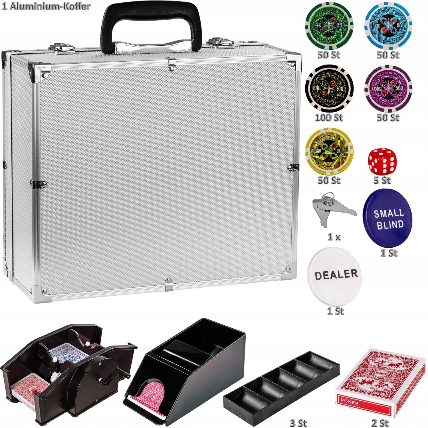 Особенно амбициозные игроки будут оценить это при укладке и микшировании. Комплект также включает в себя карточный миксер, кормушку для карт и Play Pad. Серия дополняется двумя колодами карт, 5 костей и большим слепым, маленьким слепым и дилером. Благодаря элегантному алюминиевому корпусу с элегантным внешним видом, ваш покерный набор всегда хорошо заказан и готов к игре. Искусственная