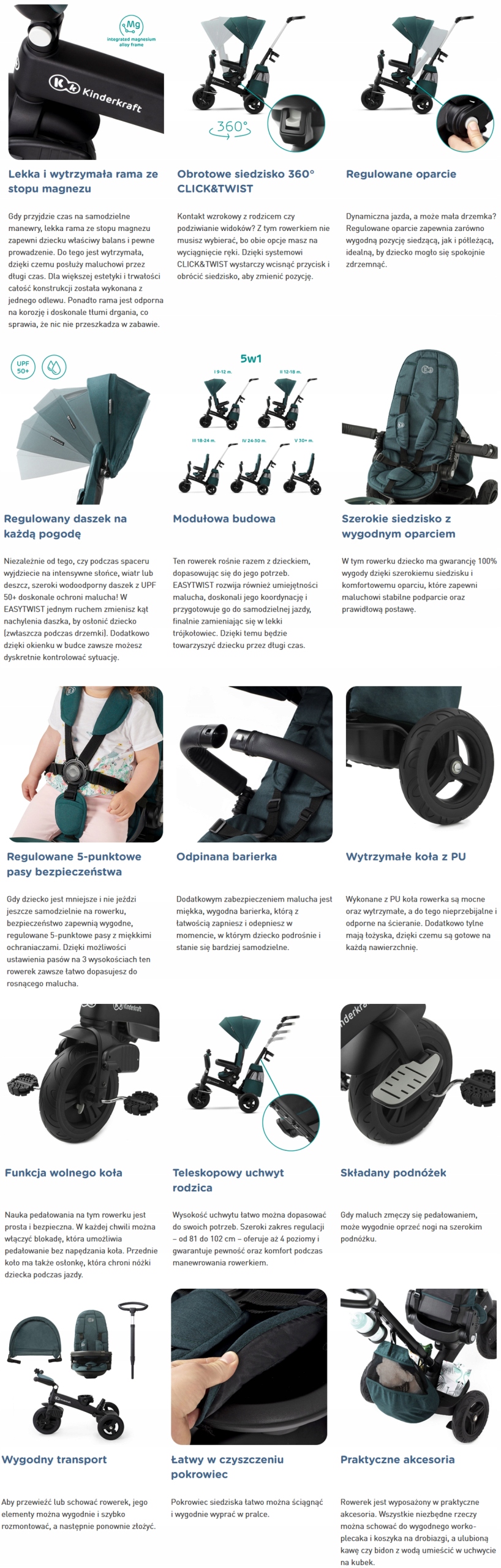 Обучение в игре в возрасте от 9 месяцев - дети хотят быть независимыми и приобретать новые навыки. Трицикл дает им такую возможность, потому что он имеет функцию «свободного колеса», которая позволяет детям безопасно учиться. Кроме того, он может быть скорректирован к углу его наклона и собирать или разбросан, в зависимости от потребностей и преобладающих атмосферных условий. С такой защитой ребенок будет любить прогулки независимо от погоды!