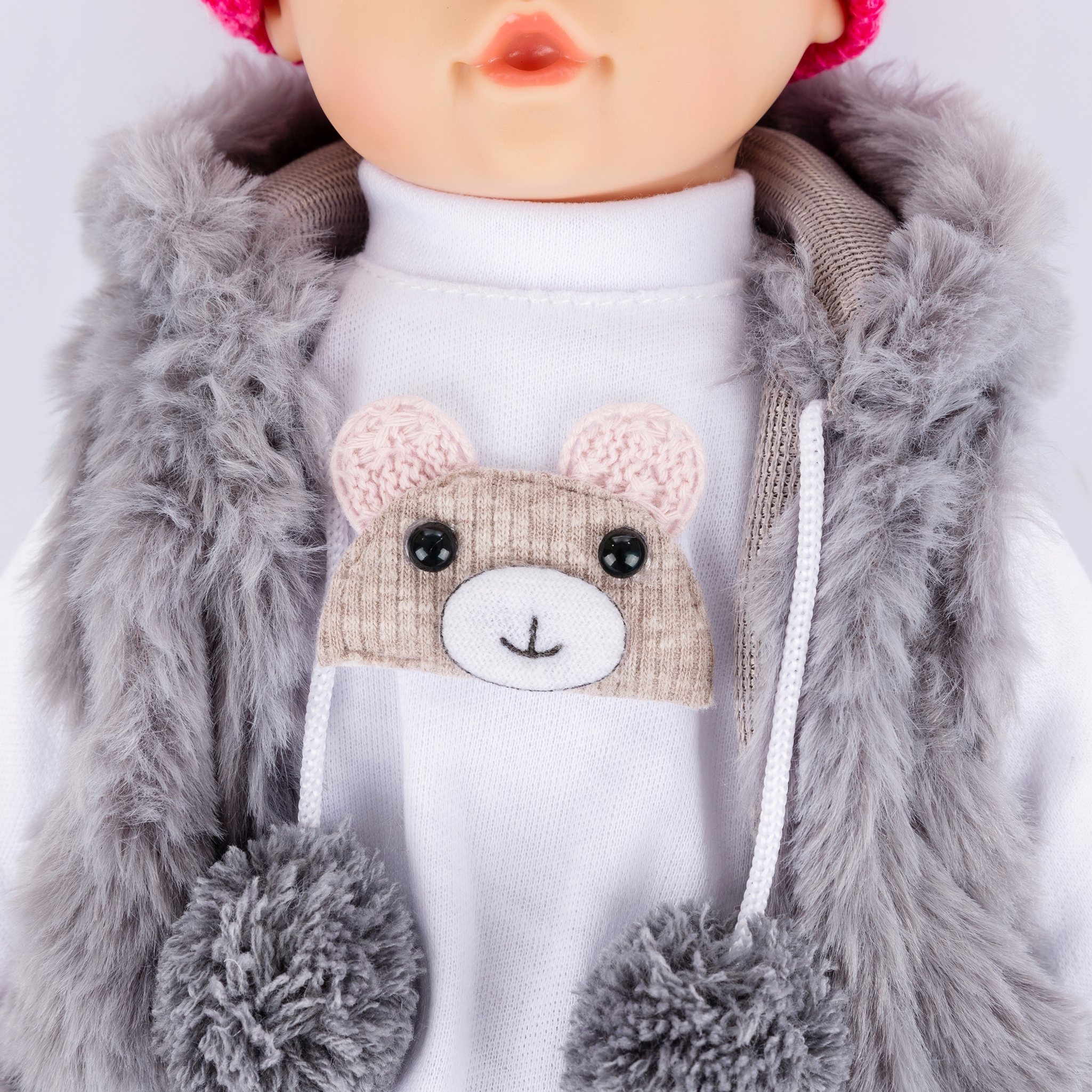 В комплект входят: шапочка, майка, кофточка, штанишки, носки. Одежду легко снять и постирать, благодаря чему куклу легко содержать в чистоте.