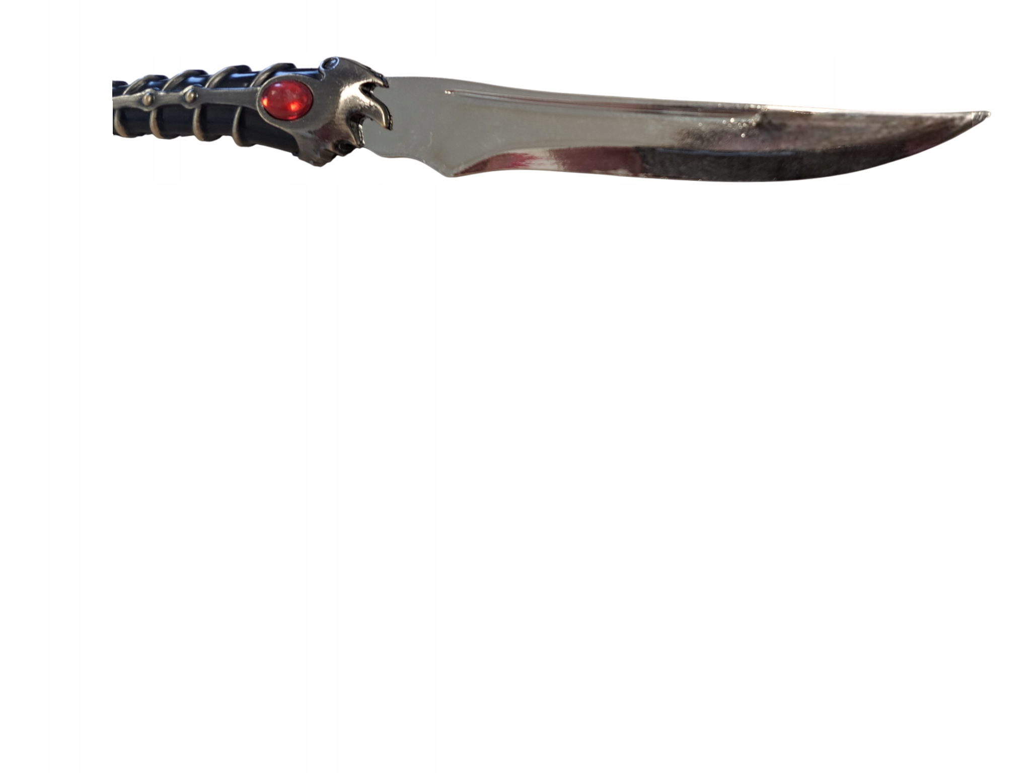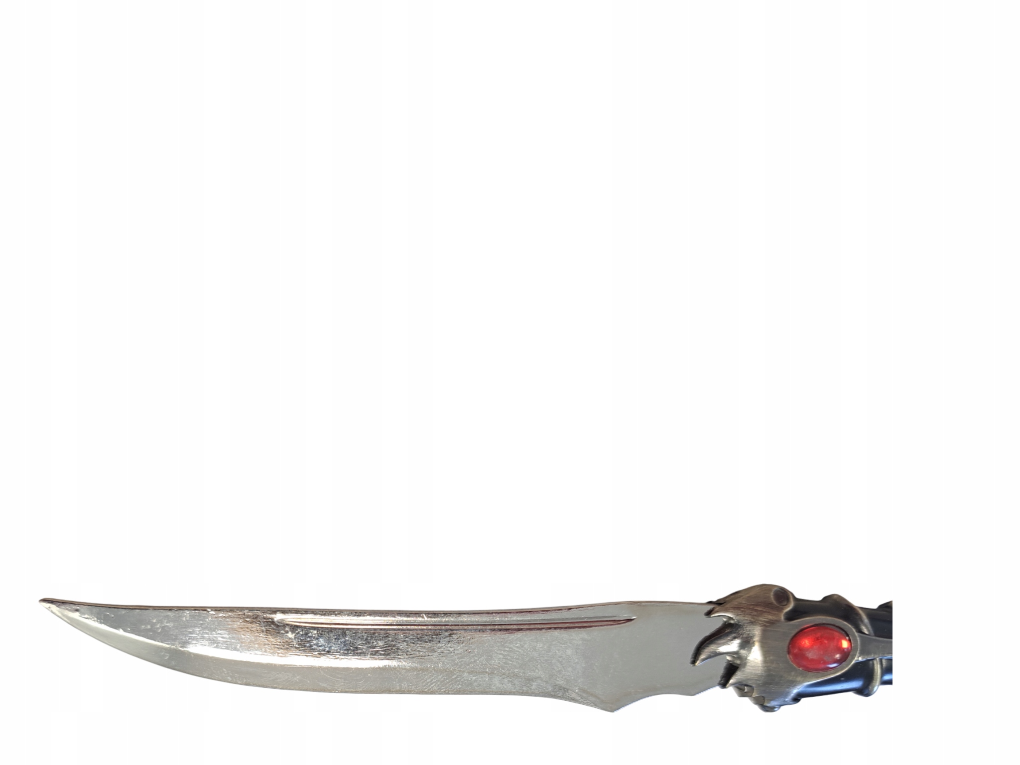 - Изготовленный из высококачественного металла, он воспроизводит детали оригинала, в том числе изогнутый клинок, черно-золотую рукоять с декоративными канавками и эффектную вставку из красного камня. цевье.