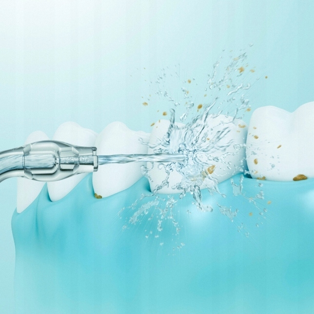 Сильный водный поток, усиленный ультразвуковым достижением между зубами и удаляет остатки пищи.