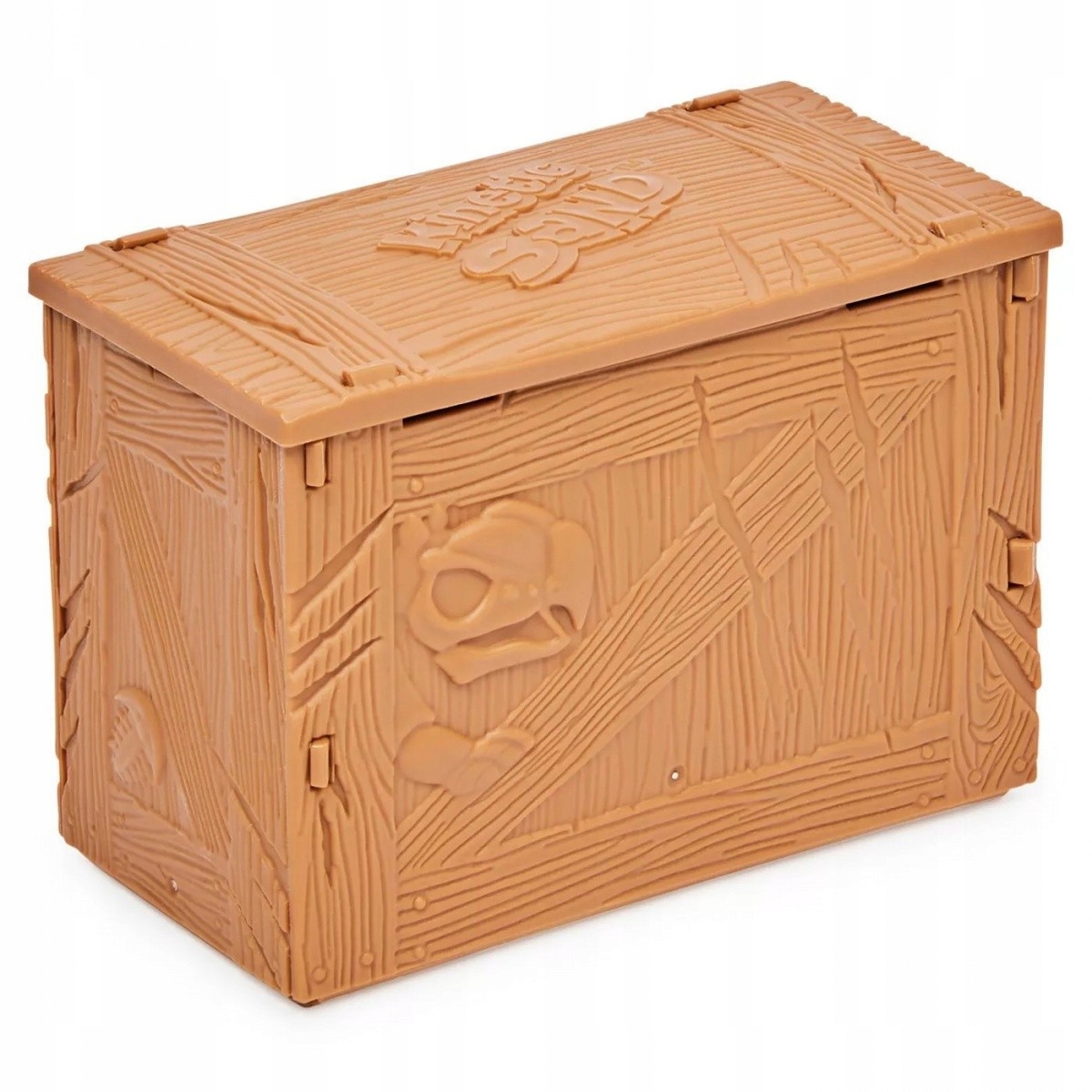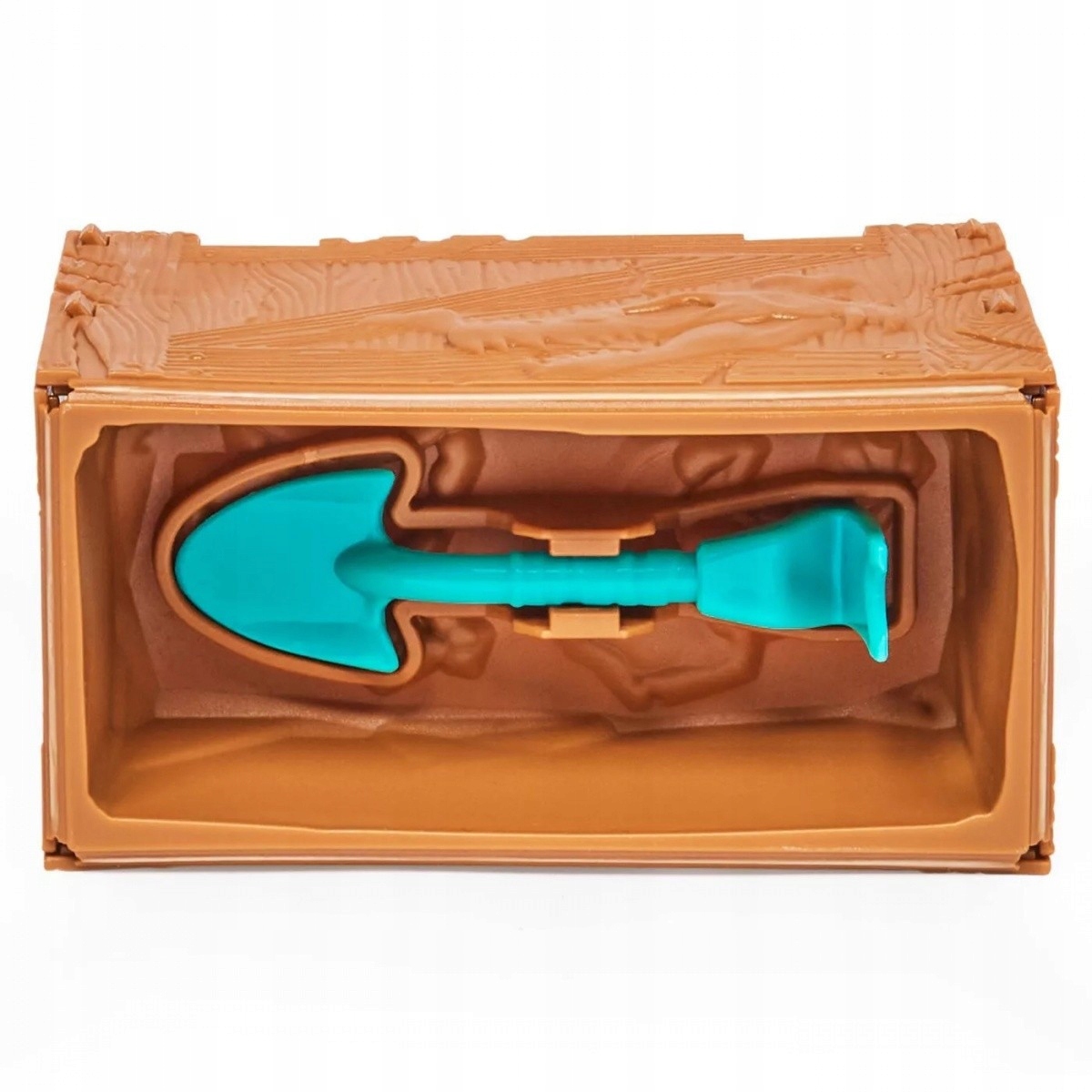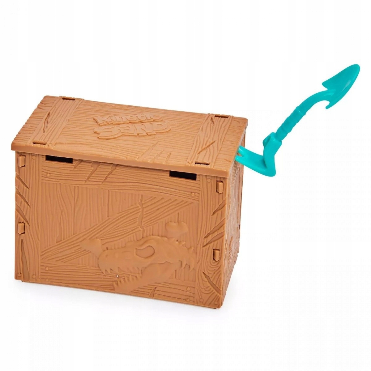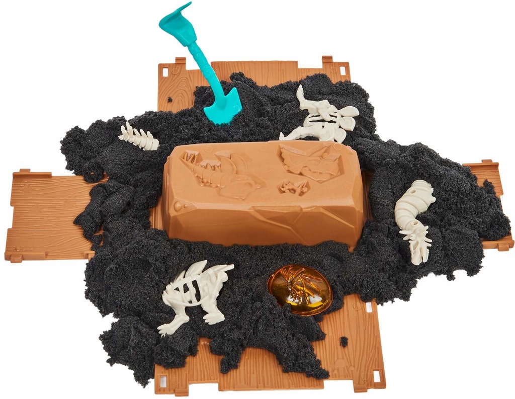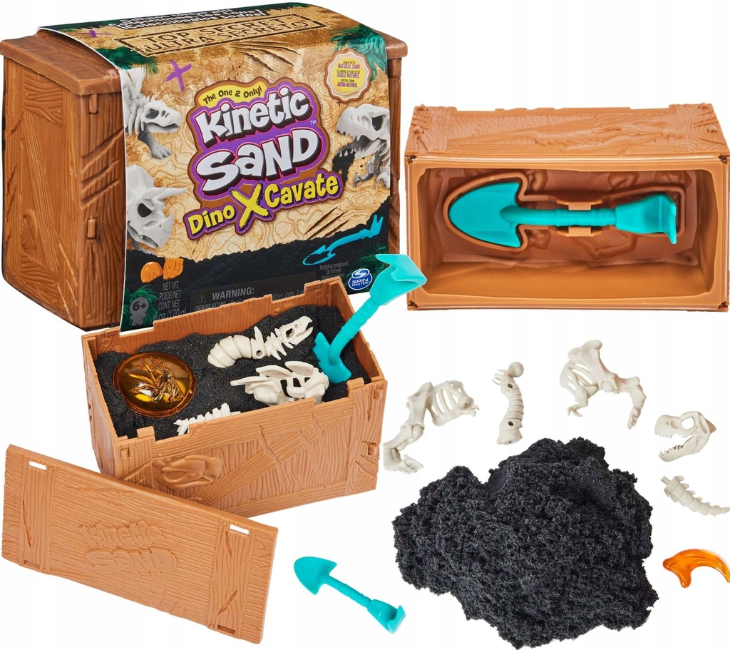 Открыть ящик с динозаврами с ломом 2-в-1, киркой и лопатой. Откройте крышку и посмотрите, как открывается сундук, в котором обнаруживается черный кинетический песок!
