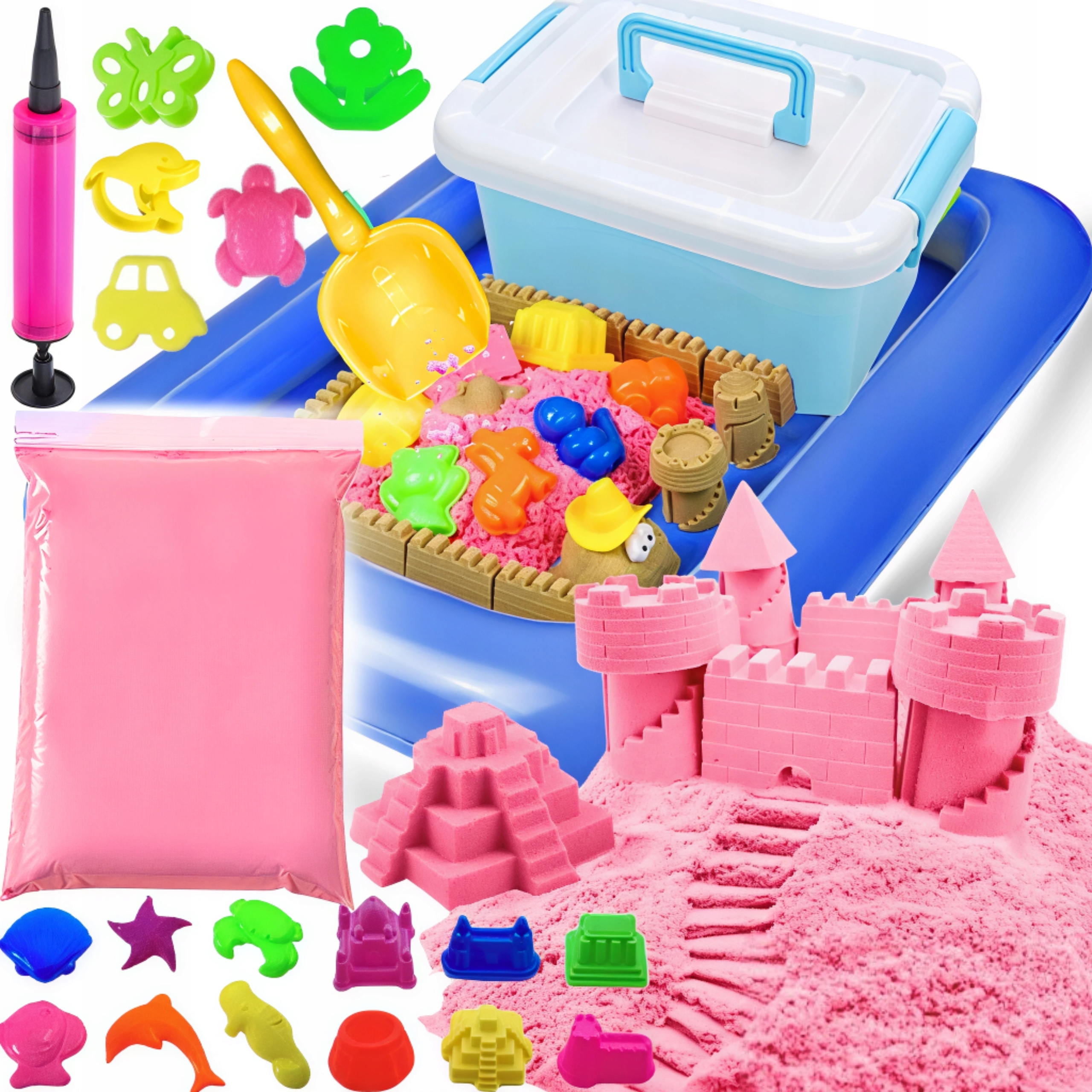 ✨ БОЛЬШОЙ НАБОР - С этим набором вашему малышу не будет скучно! Внутри вы найдете: 2,5 кг песка, большой набор разноцветных формочек, лопатку и аксессуары для творческих игр. Дополнительно в набор входит надувная песочница, благодаря которой легче поддерживать порядок, и насос для быстрого надувания бассейна.
