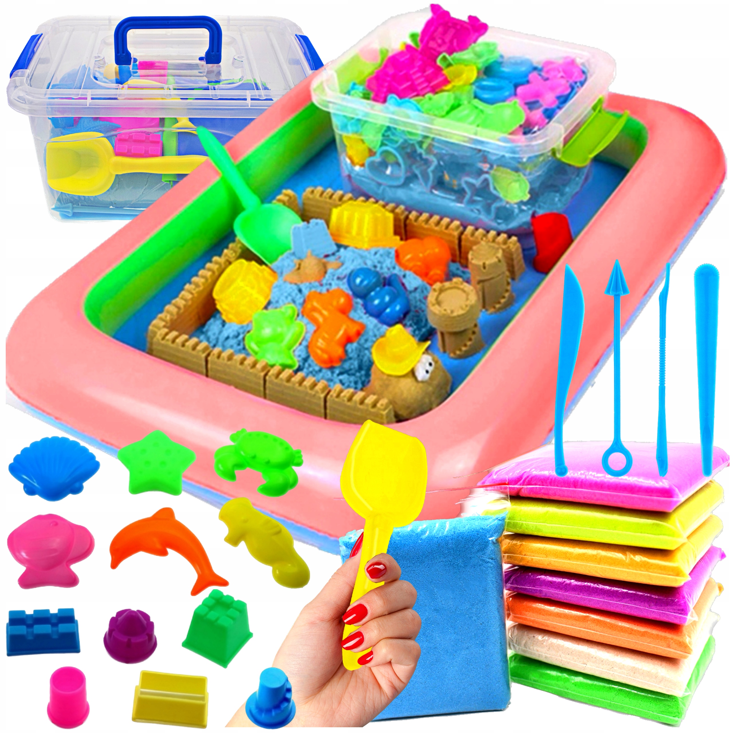 КІНЕТИЧНИЙ ПІСОК 5 кг + ФОРМИ ДЛЯ БАСЕЙНУ ШПАТУЛЬ ПАЛИЧКИ ПІСЧНИЦЯ XL НАБІР