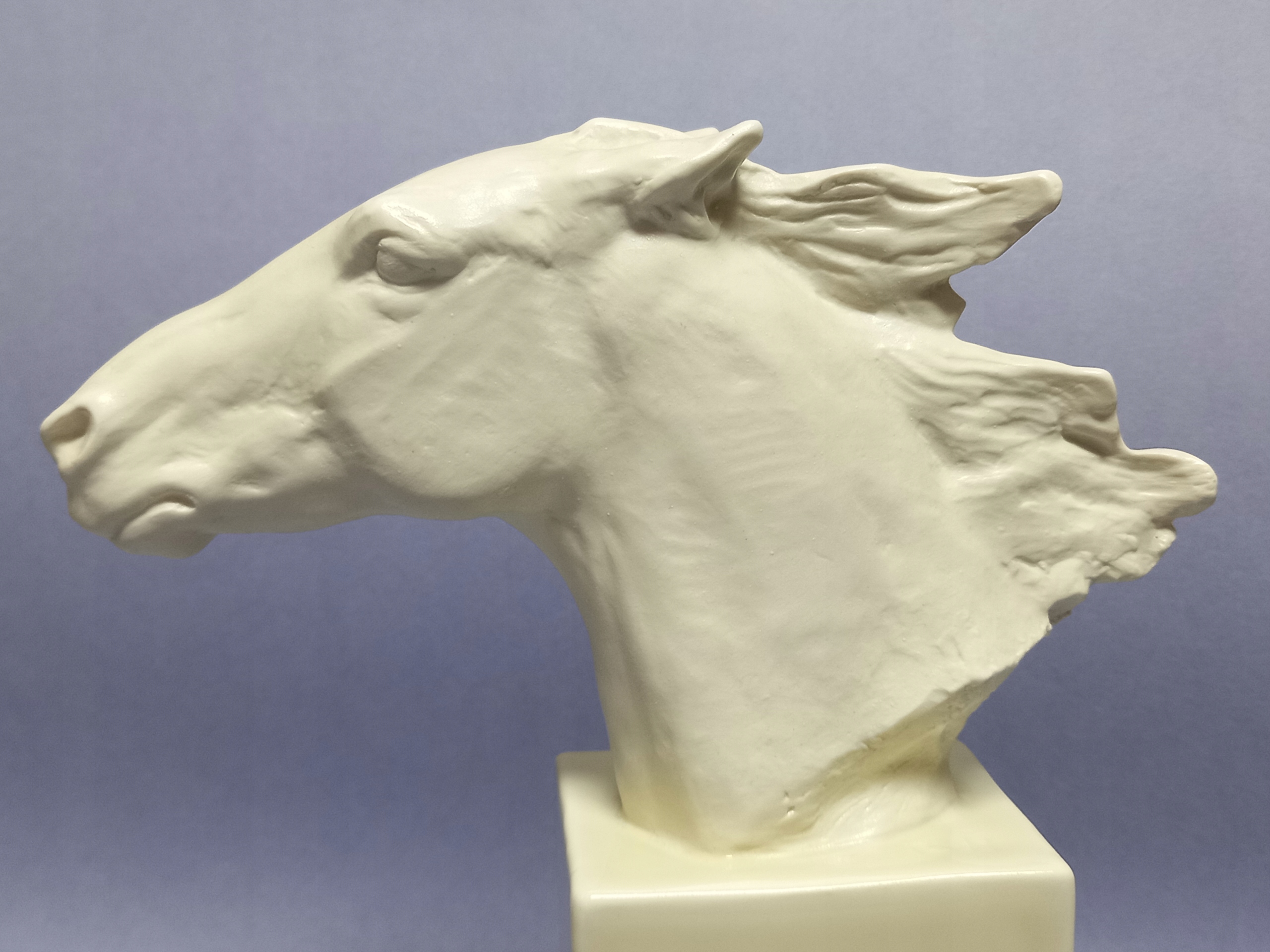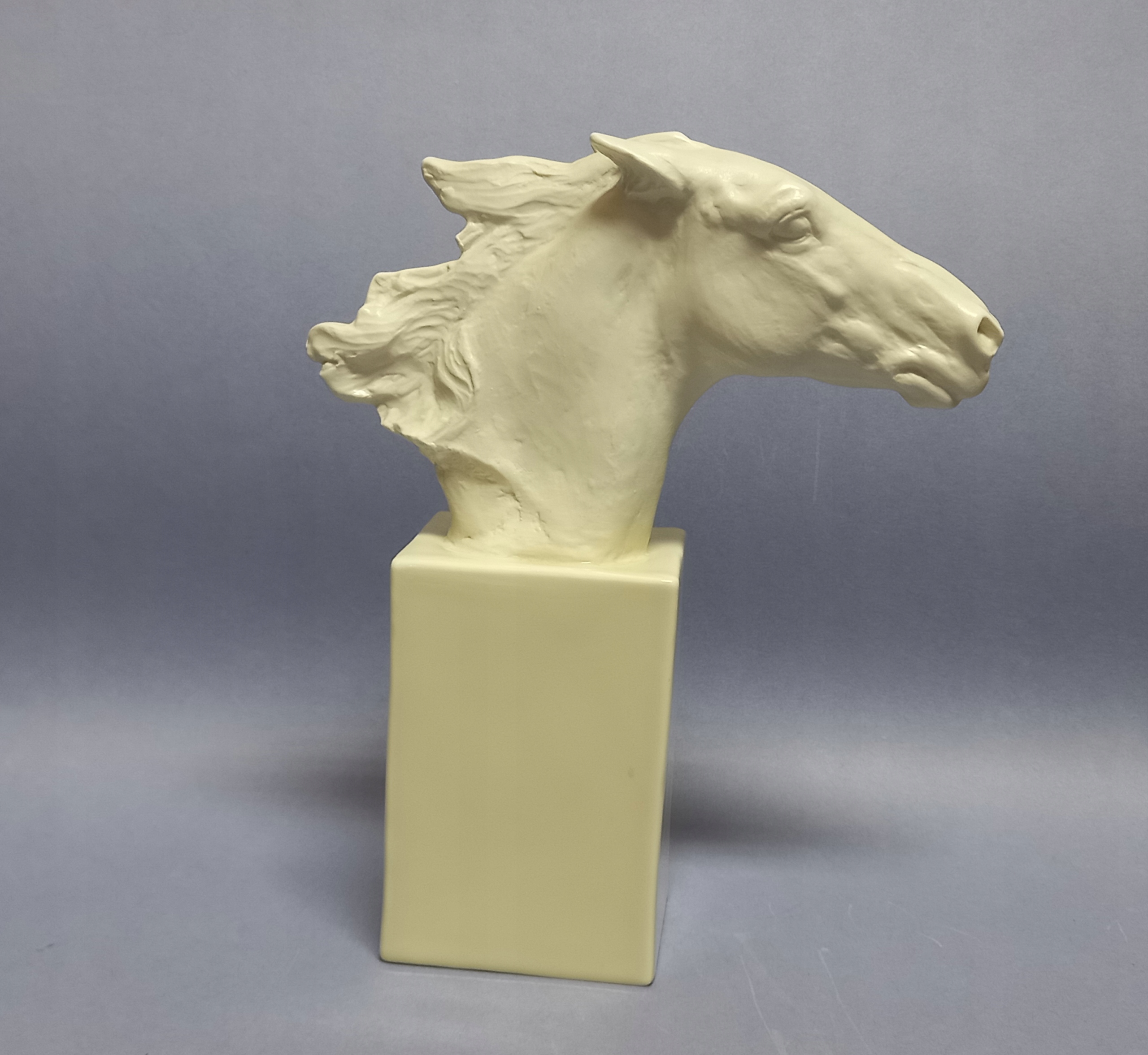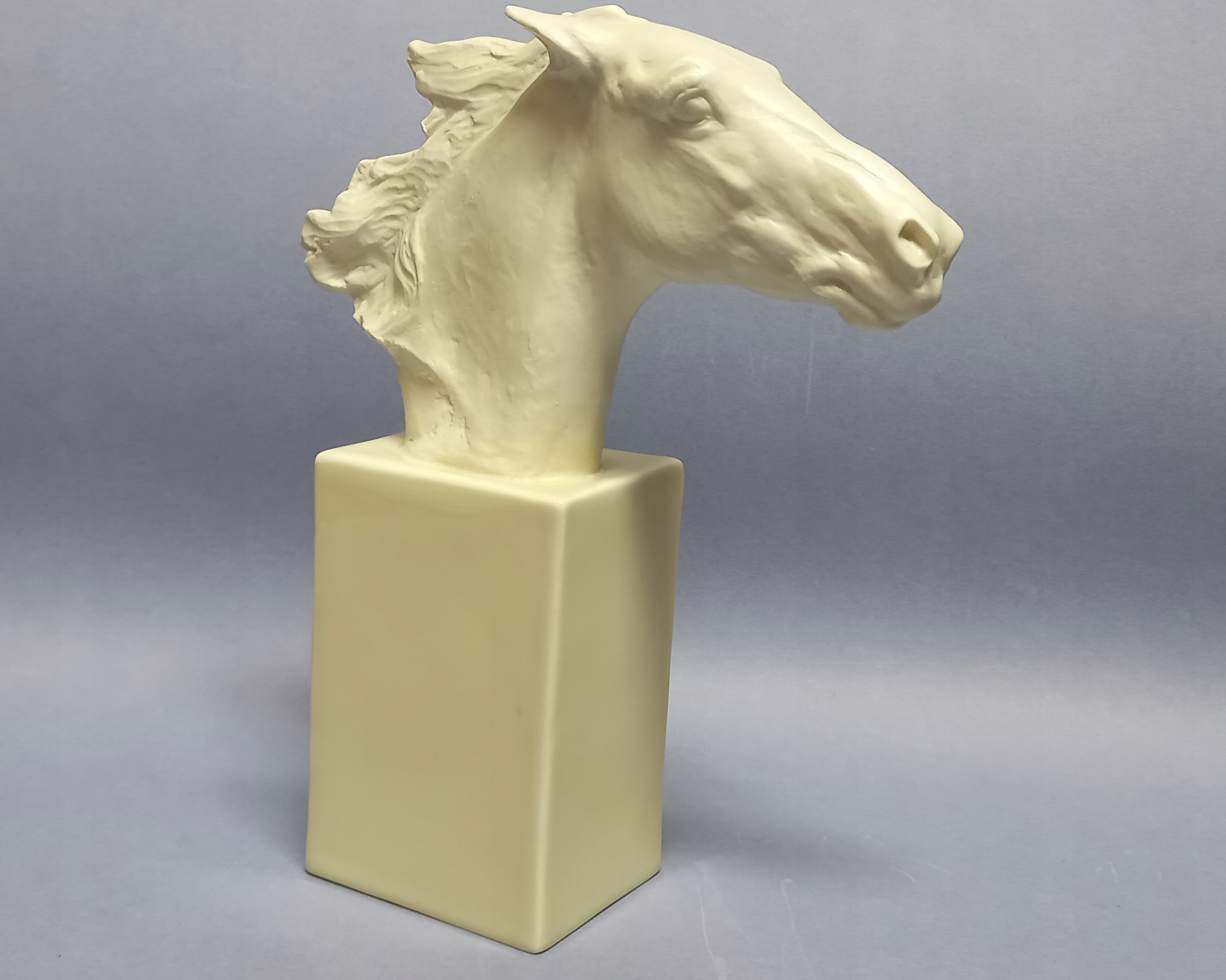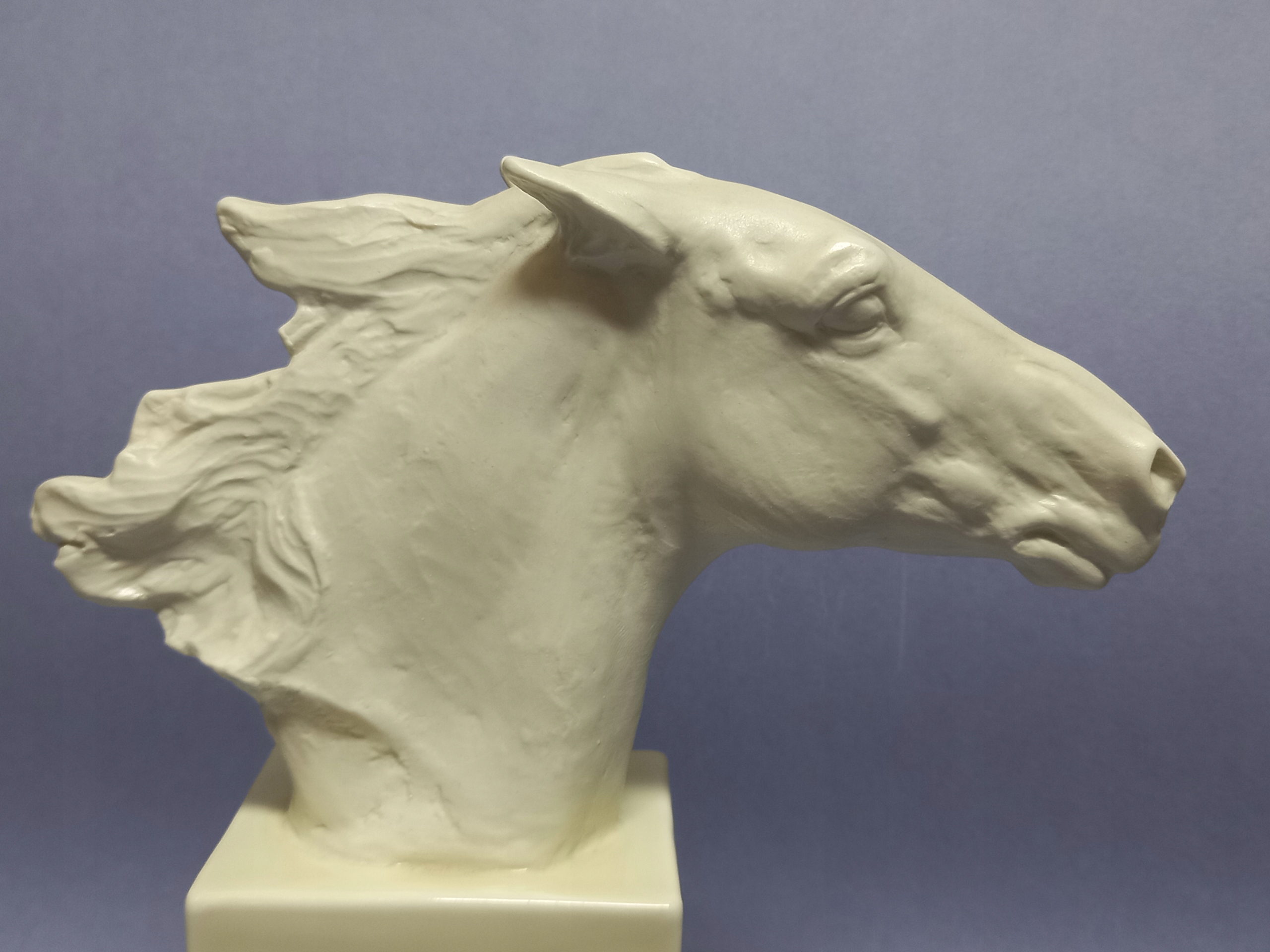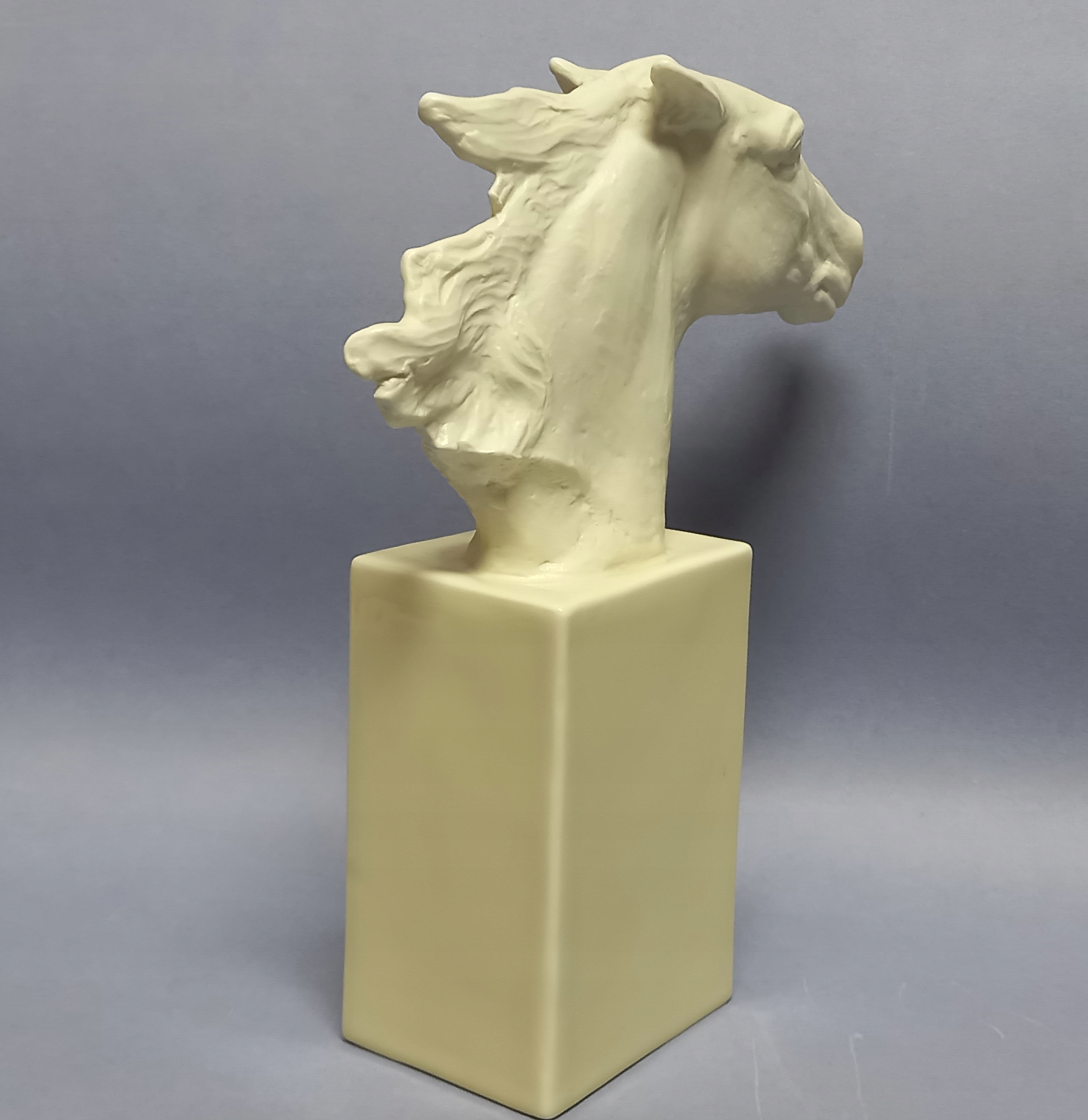 Фарфор кремового цвета, реалистично сформирован - с большой тщательностью в отношении каждой детали. Основание - глазурованный постамент, голова лошади без эмали, полированная.