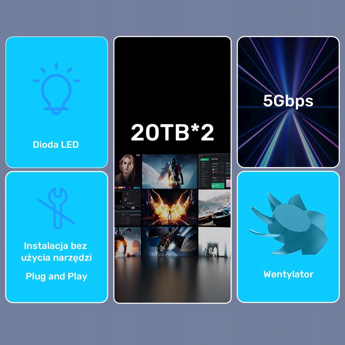 ta карман для дисков оснащен серией гипертонии, анти -религиозной и антисвязи. Диски во время операции выделяют большое количество тепла - поэтому корпус этого кармана сделан из алюминиевого сплава, который является его превосходным руководством, а сама жара направлена из дисков к корпусу через эффективный вентилятор, расположенный внутри устройства.