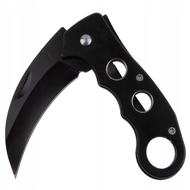 Нож имеет характерное, агрессивно изогнутое лезвие и отверстие в задней части.