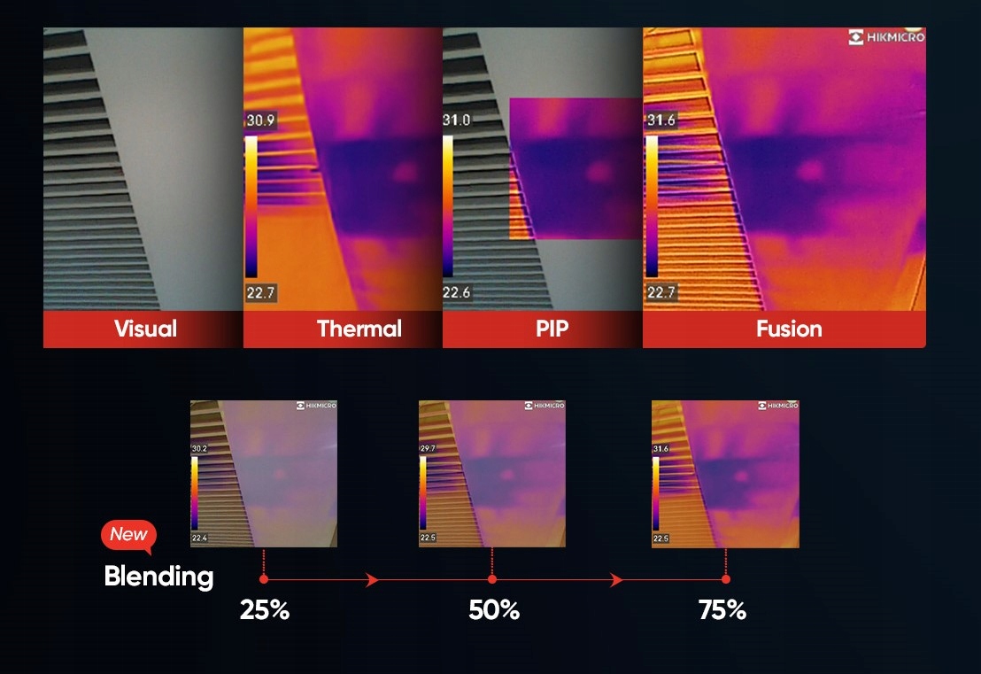 Встроенные тепловизионная и оптическая камеры Pocket 2 позволяют использовать пять режимов отображения изображения: тепловизионный, оптический, «картинка в картинке» (PIP), объединение и микширование. Режим «Слияние» обогащает тепловизионное изображение деталями оптической камеры разрешением 0,3 МП, что повышает его читаемость и точность. Режим «наложения» перекрывает тепловое и оптическое изображения, позволяя регулировать степень прозрачности инфракрасного изображения. В свою очередь, «PIP» позволяет разместить фрагмент теплового изображения непосредственно на оптической фотографии, что способствует точному определению местоположения источника проблемы.