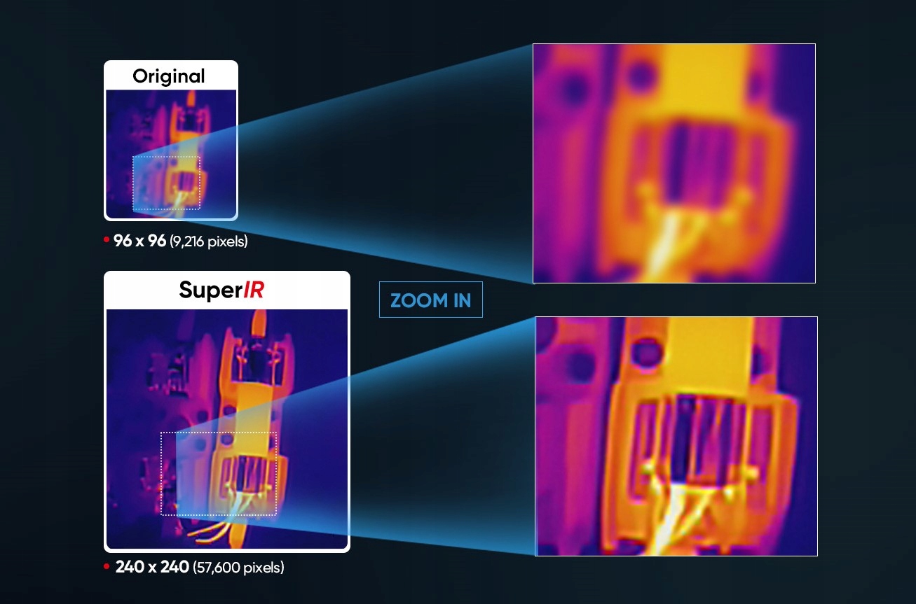 Технология Super IR улучшает изображение, масштабирует его с разрешения 96x96 пикселей до 240 x 240 пикселей во время предварительного просмотра изображения в реальном времени с высокой частотой обновления. Это позволяет проводить более точные измерения и наблюдения за исследуемой поверхностью (касается)