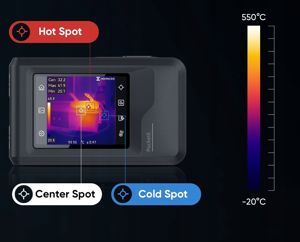 Прибор позволяет записывать радиометрические изображения на весь экран и автоматически определять точки с самой высокой, самой низкой и средней температурой, что позволяет быстро выявлять тепловые аномалии