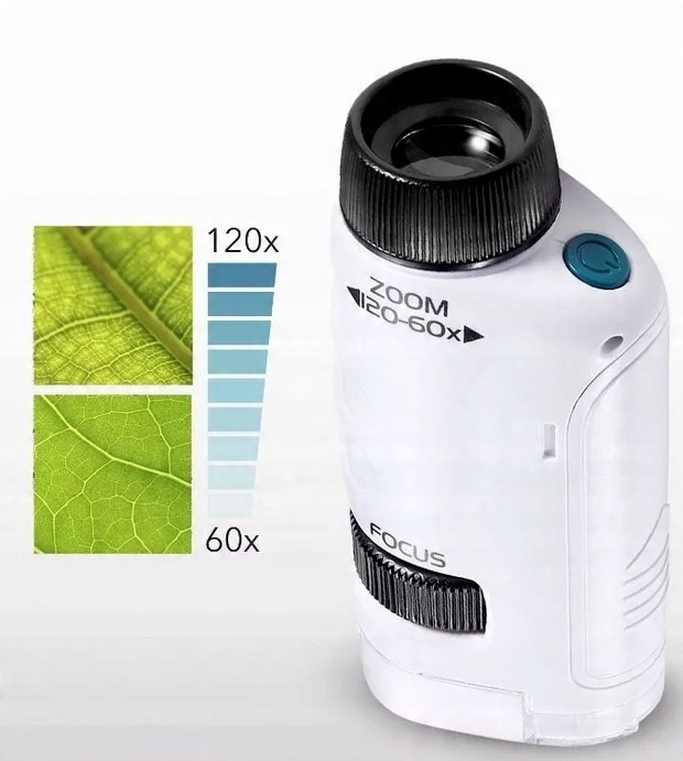 Mikroskop kieszonkowy Zoom 60 i 120 z podstawką próbkami oraz uchwytem tel.