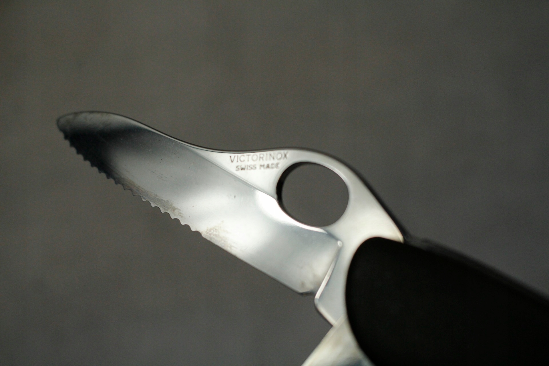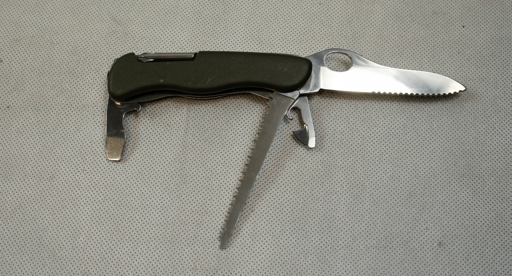 Карманный нож имеет частично зазубренное лезвие, пилу, открывалки для консервных банок и крышек, отвертку и другие полезные функции.
