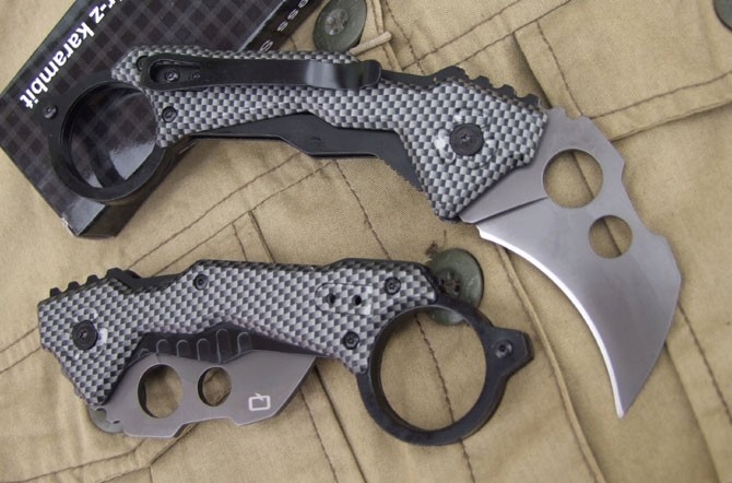 Отличное качество изготовления. Складной нож по образцу индонезийских ножей Carambit, используемых для самообороны.