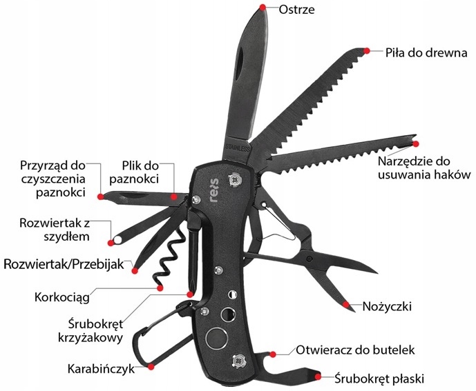 ✅ 15 в 1: лезвие, пила по дереву, рыбочистка, устройство для снятия крючков, ножницы, консервный нож, открывалка для бутылок b> , плоская отвертка, крестовая отвертка, развертка/перфоратор, пилочка для ногтей, средство для чистки ногтей, развертка с шилом, штопор, карабин