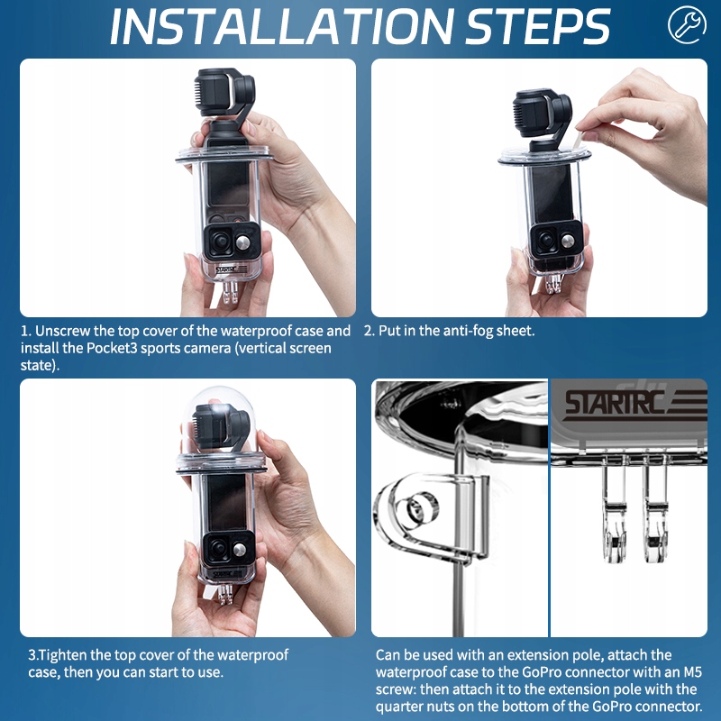 Водонепроницаемый корпус, специально предназначенный для кармана DJI 3. Водонепроницаемая глубина до 45 метров/147 футов, отвечающих потребностям стрельбы по дайвингу, серфинга, подводного плавания, плавания и других водных видов спорта. Двойное соединение, которое позволяет легко подключаться на основе различных потребностей в фотографии и может быть расширено на другие адаптеры.