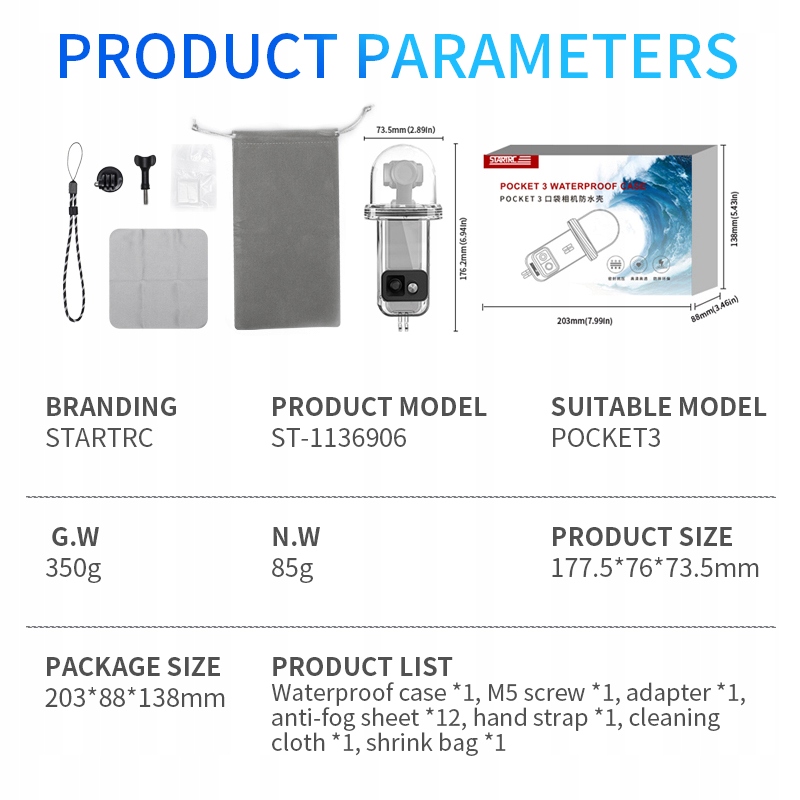 Пакет содержит: водонепроницаемое корпус *1, винт M5 *1, адаптер *1, лист тумана *12, ручная ремешок *1, чистящая ткань *1, термоконцинатный мешок *1 (примечание: прикреплено)