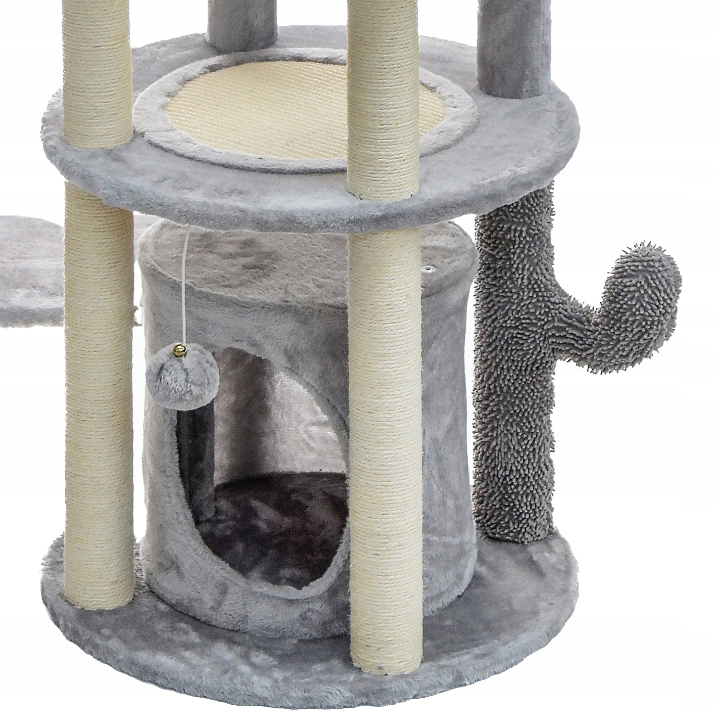 Большой царапин кошки, изготовленного из мягкого плюшевого, идеально подходит в качестве игровой площадки и места отдыха для измерительного вреда. Некоторые из царапинных ставок были завернуты в сзизал для истирания когтей. Кошковое дерево было оборудовано двумя логовыми базами, предназначенными для кошачьего сна и одного стенда. Помпомы игрушек были прикреплены к царапинам, которые с первых моментов интригуют котенка.