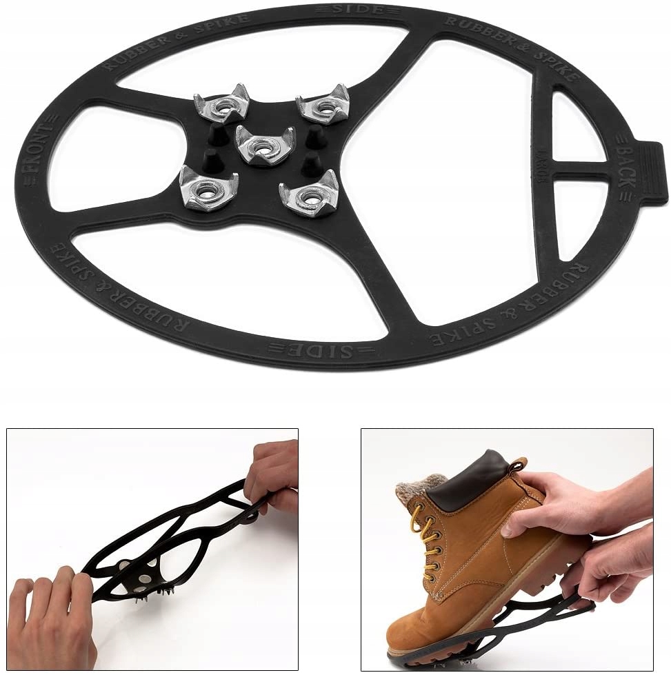 Просто наденьте накладки на обувь, и все готово. Изготовленные из прочной, эластичной резины, они идеально повторяют форму обуви. Они также оснащены металлическими шипами для захвата.