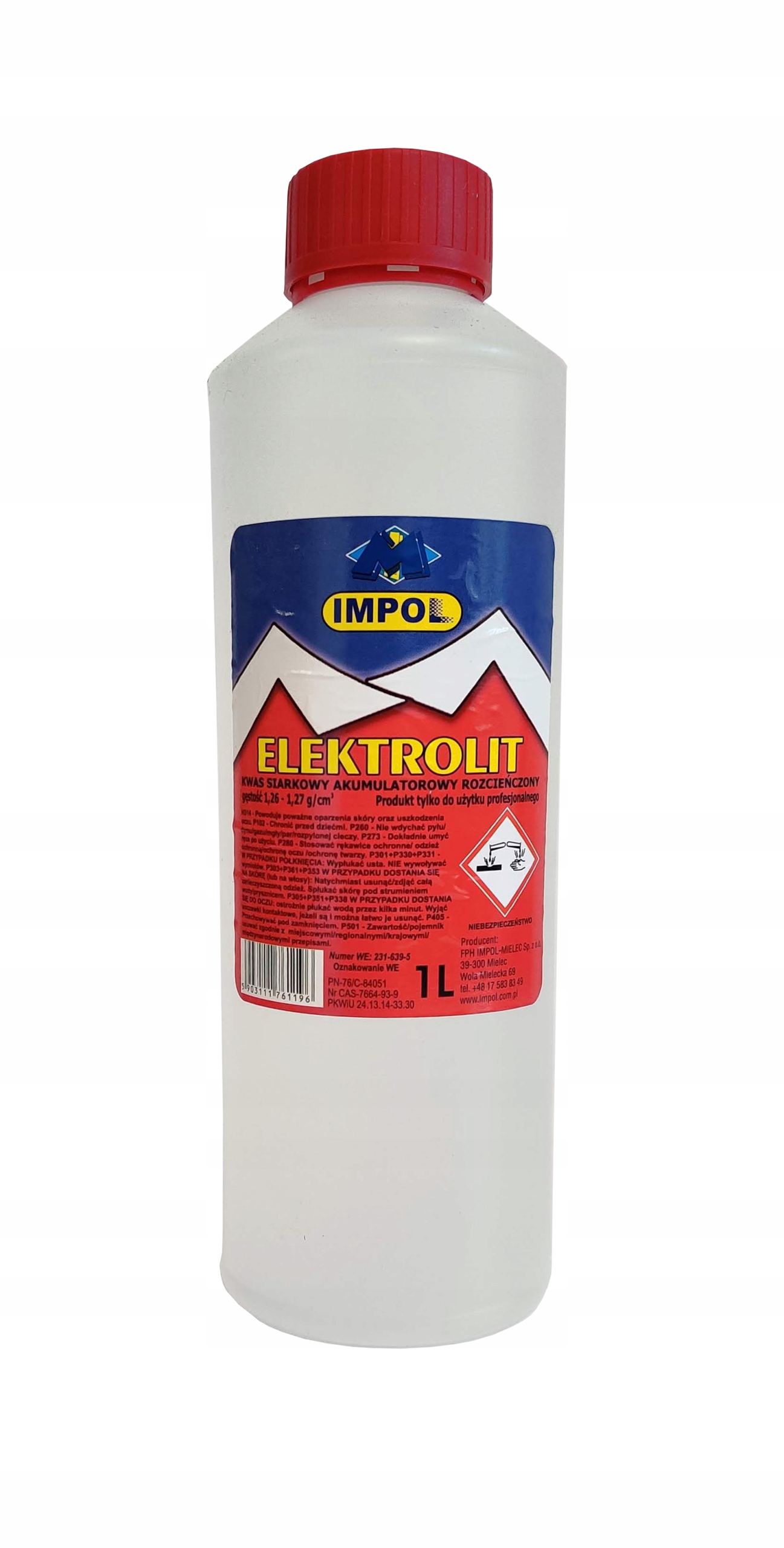 Новый продукт, польский производство . Аккумуляторный электролит (серная кислота) – продукт, позволяющий восполнить уровень электролита в аккумуляторах. При его использовании помните, что кислота при попадании на кожу вызывает серьезные ожоги, поэтому у нее есть безопасный колпачок, но все же следует хранить ее в недоступном для детей месте и быть очень осторожным при ее использовании. Продукт только для профессионального использования. Коррозионное вещество. Соответствует всем стандартам и имеет сертификаты.