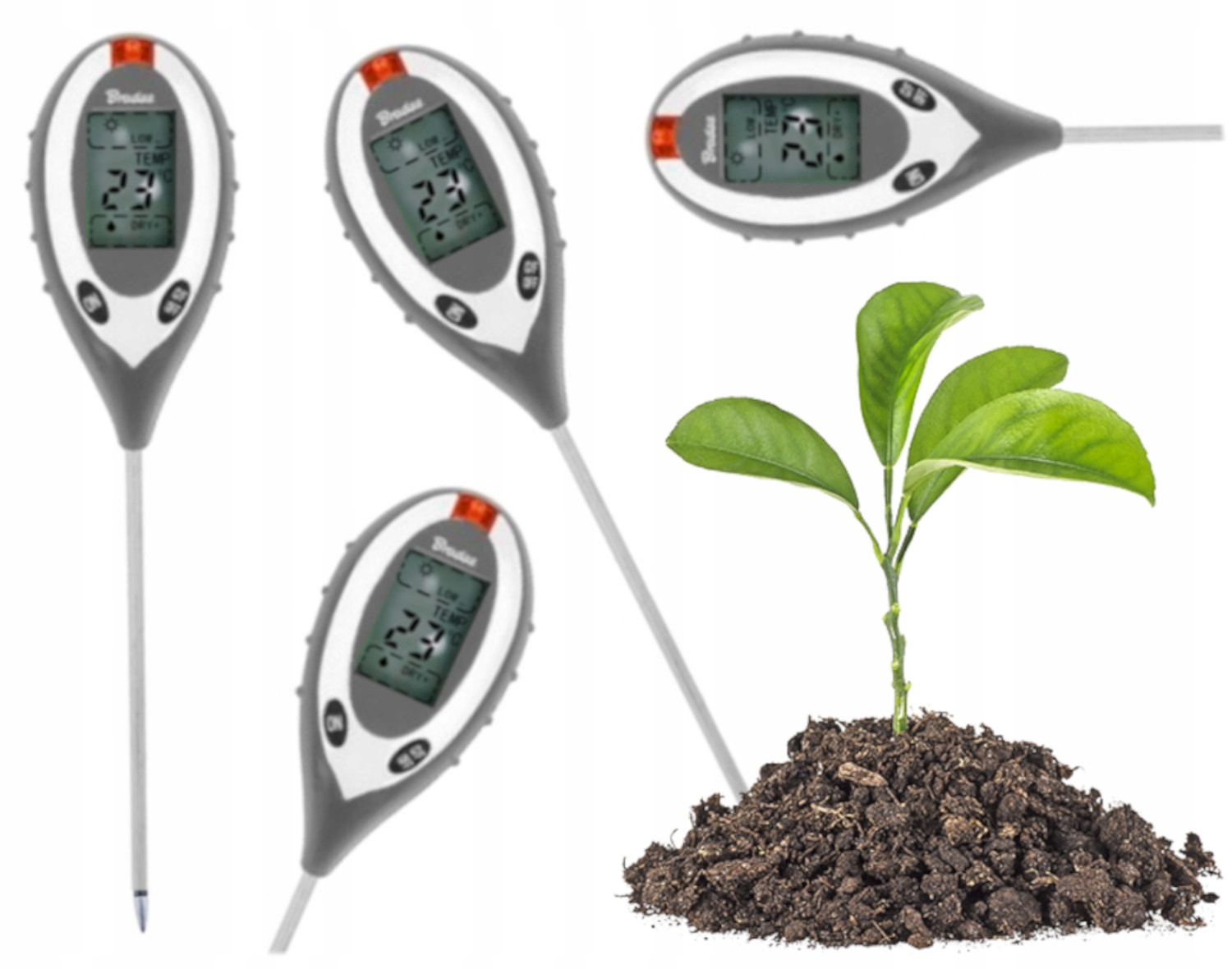 - Аккуратно и вертикально вставьте зонд в почву. Включите прибор.