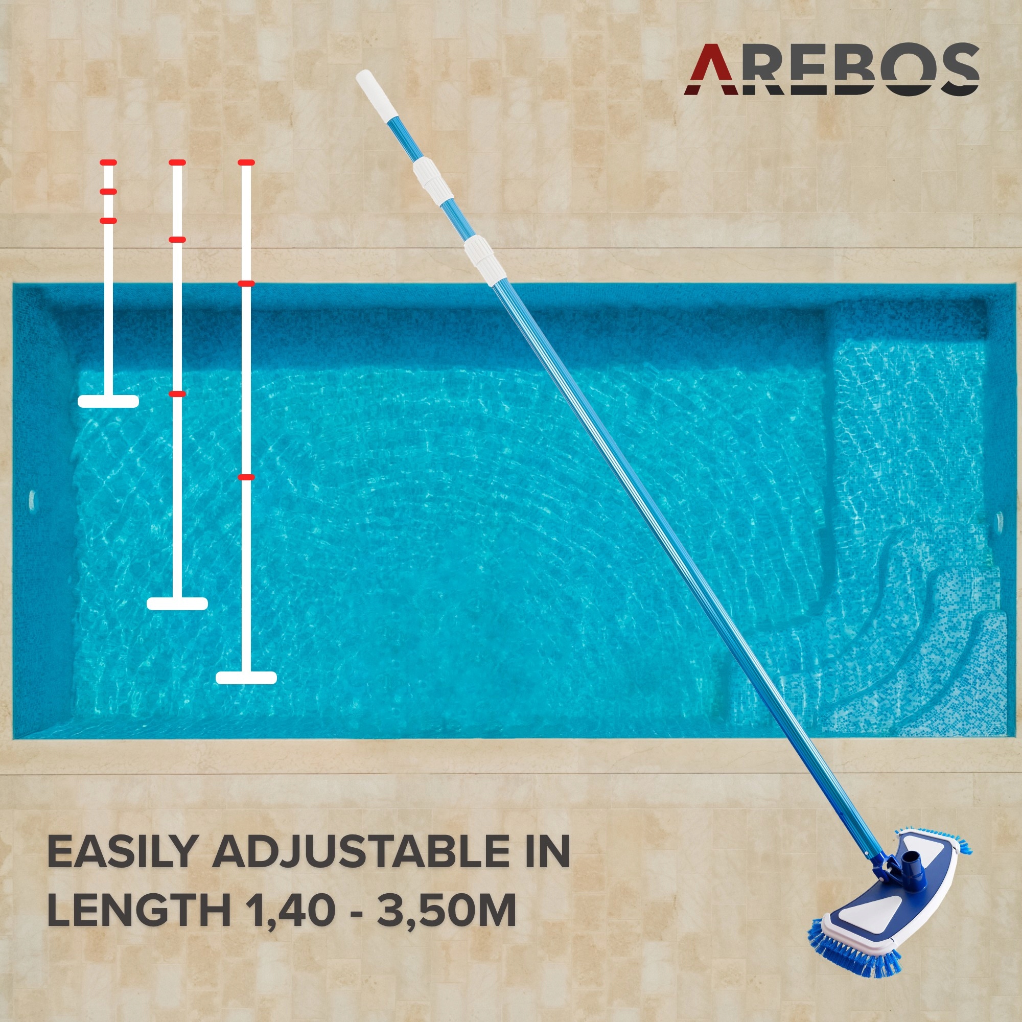Используя средства для очистки ДНК Arebos, вы легко и комфортно удалить самую стойкую грязь с нижней части бассейна. Он состоит из кисти, телескопического стержня и змеи. Телескопическая палочка позволяет отрегулировать длину ручки в диапазоне от 1,40 до 3,50 метров. Это означает, что вы также можете использовать наш набор в больших бассейнах. Шланг может быть подключен к насосу или направленной загрязненной водой непосредственно к системе фильтров через скиммер