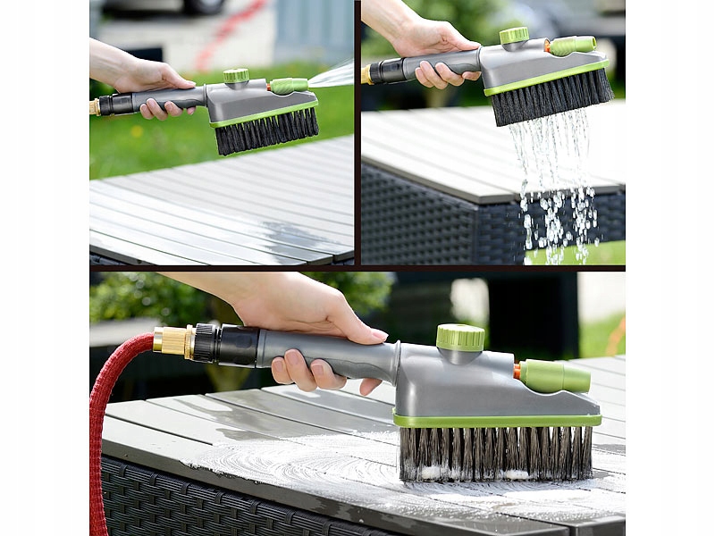 Когда он начинает становиться теплее, вы можете подумать о том, чтобы вытащить садовую мебель или велосипед. После нескольких месяцев хранения вся грязь должна быть удалена из них. Великолепный помощник будет специальной чистящей кистью от Royal Gardineer. Все, что вам нужно сделать, это соединить наконечник к садовому шлангу и открутить воду - вода начнет течь от дна кисти. Этот практический аксессуар имеет длинные щетинки, которая тщательно очистит поверхность. И когда все тщательно вымыто, переключитесь на сопло на передней части кисти и промойте грязь