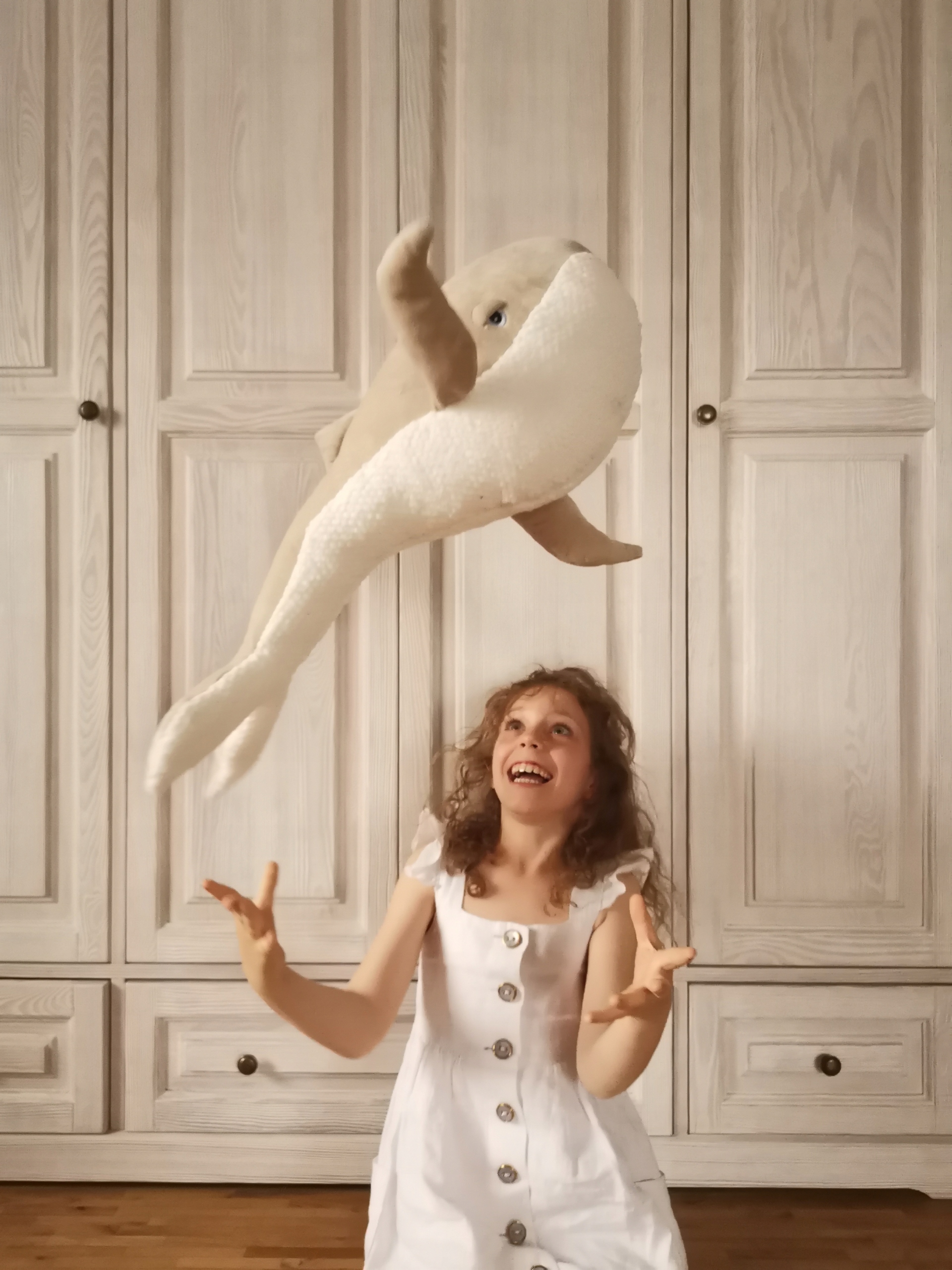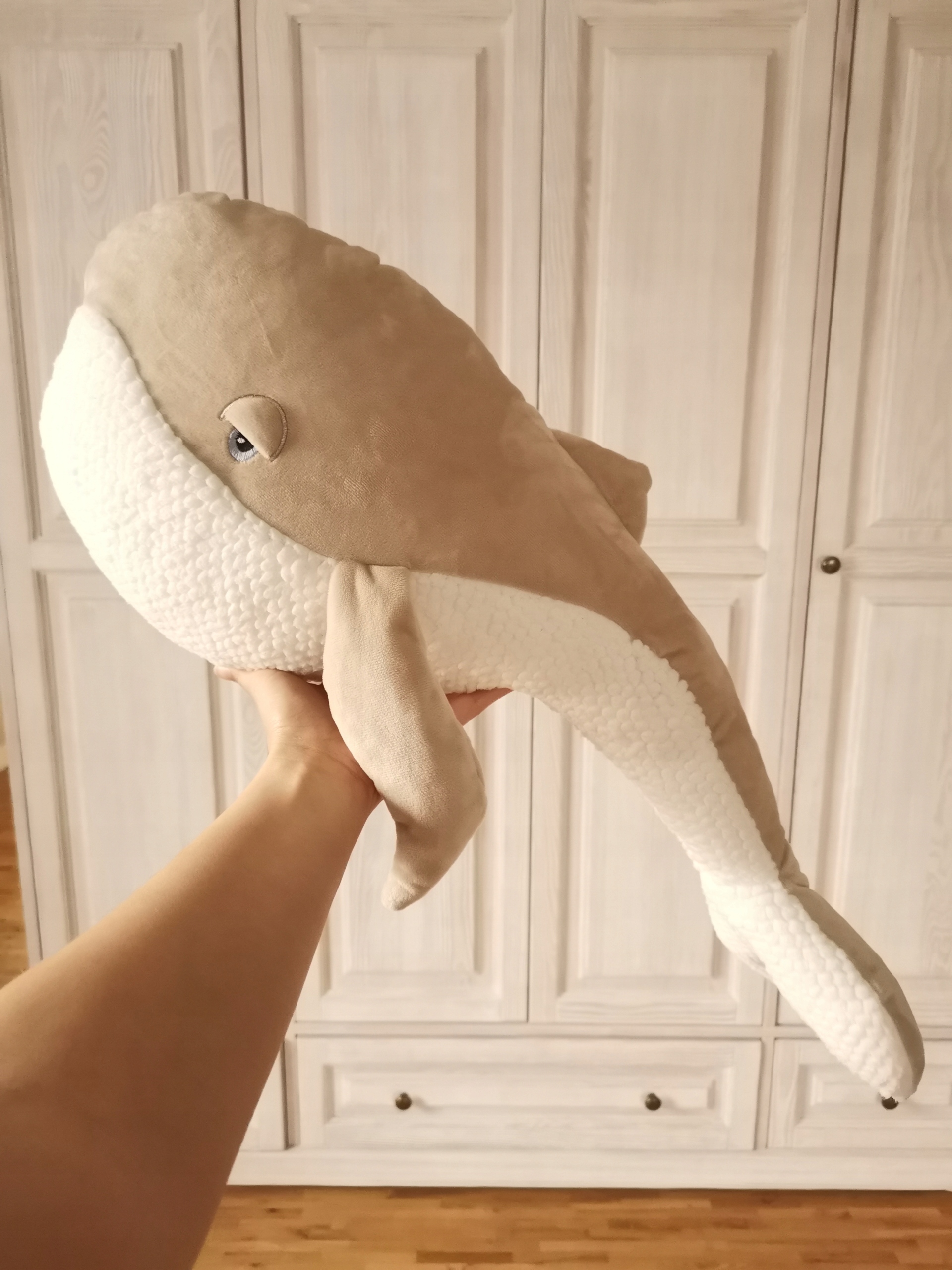 Красиво выполненный кит из бежевого бархата с плюшевым белым брюшком и наполнен анти -аллергенный силиконовый шарик. Рекомендуется любителям морских путешествий. Изготовлен из высококачественных материалов.