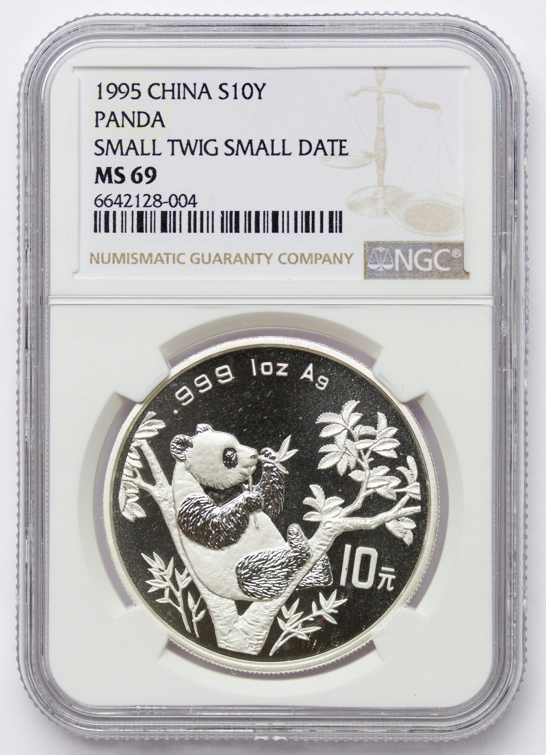 Китай, 10 юанів 1995, Панда, NGC MS69, Маленька гілочка, Маленька фініка, Маленька гілочка