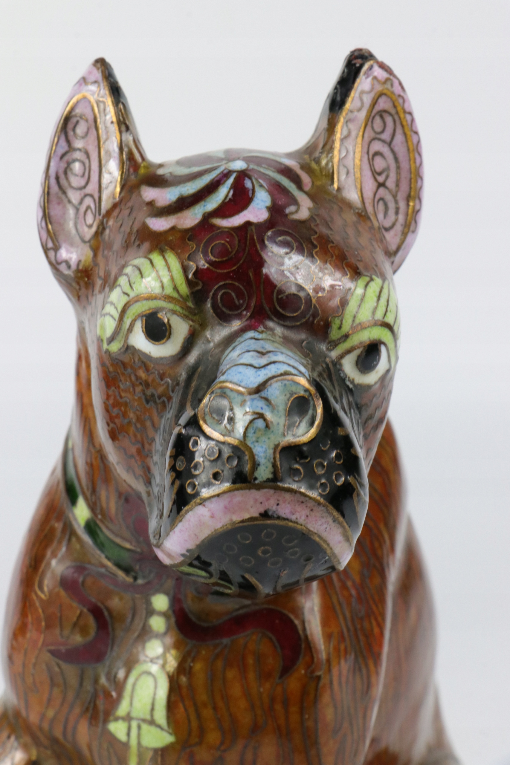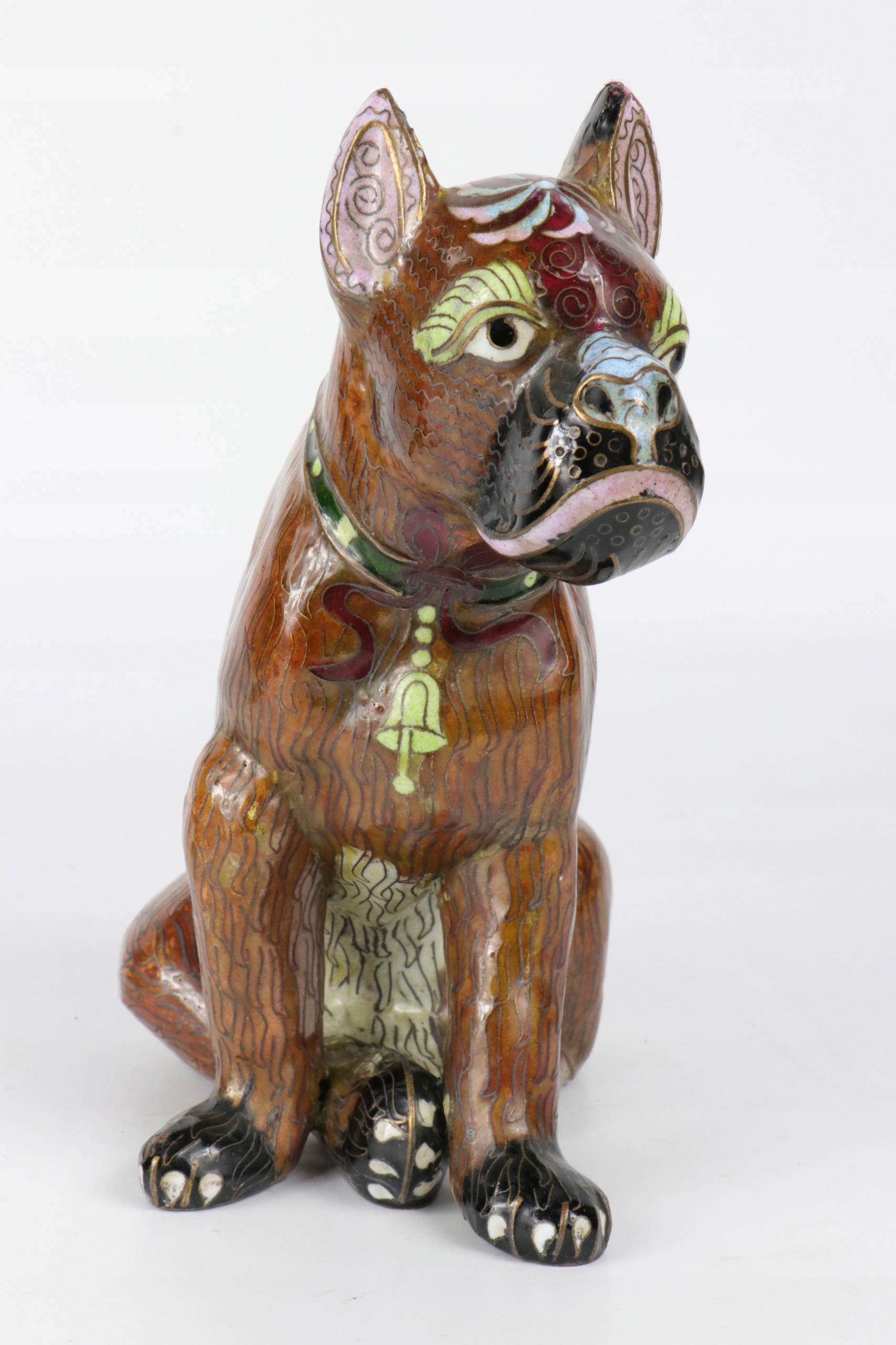 Интересное изделие из клеточной эмали собак породы боксер. Красиво смоделированный боксер, эмаль различных оттенков, китайский иероглиф на голове собаки.
