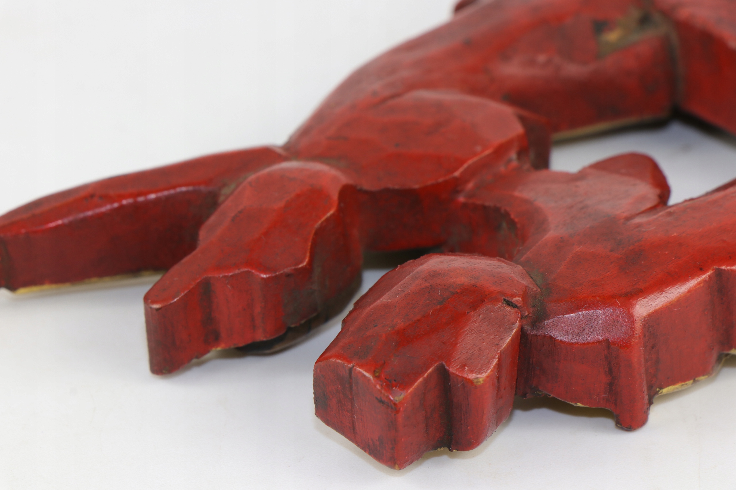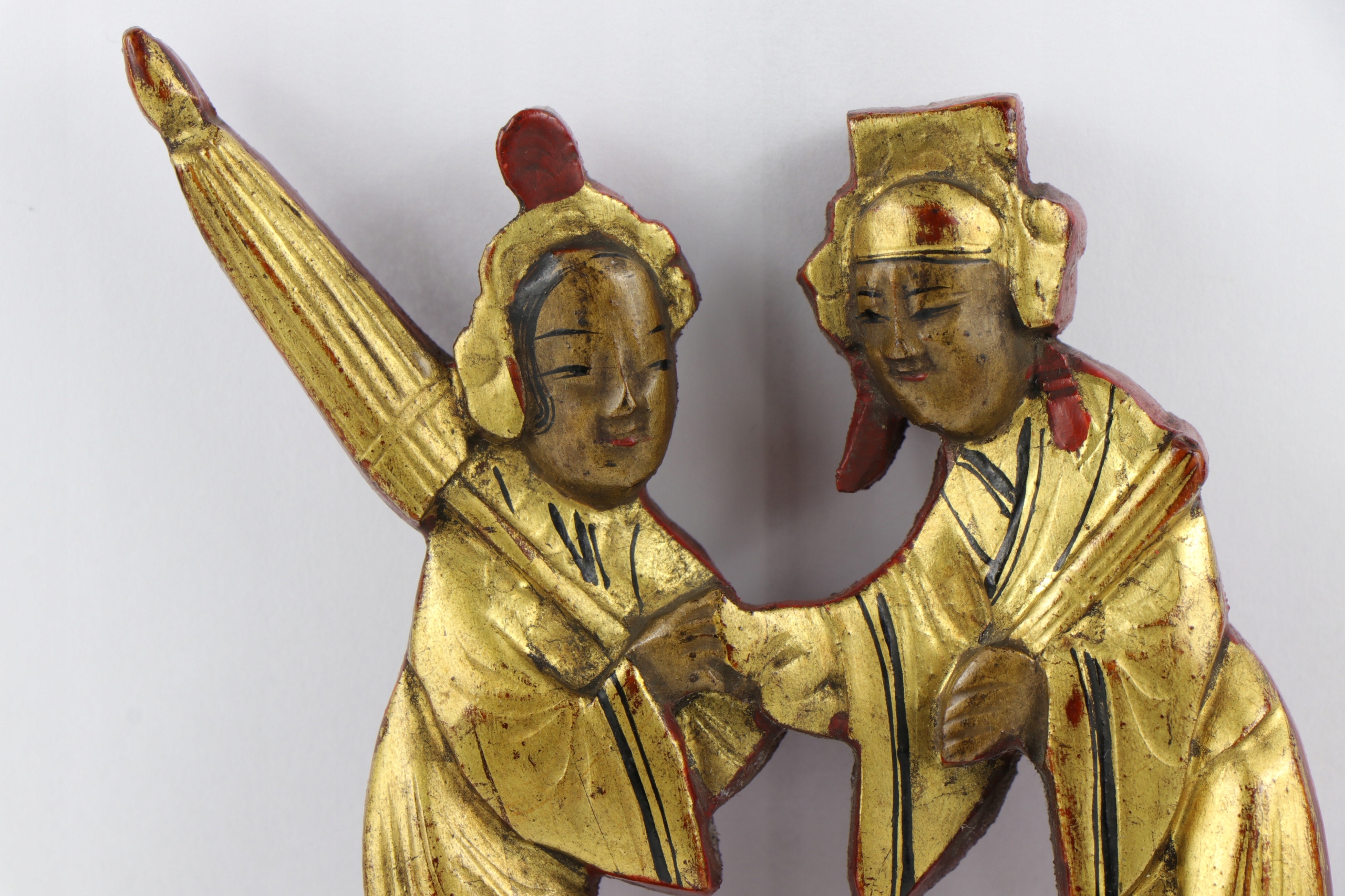 Интересная старинная китайская полихромная, позолоченная скульптура, скорее всего, покрытая красным лаком. Скорее всего, декоративный элемент старинного китайского предмета мебели.