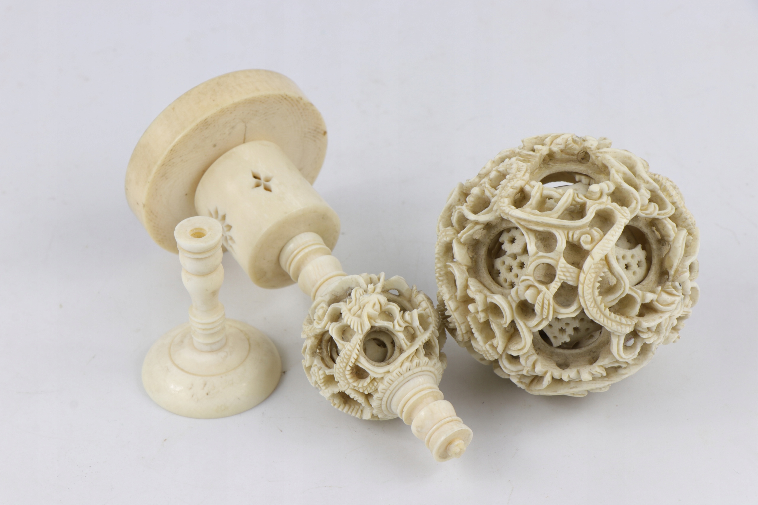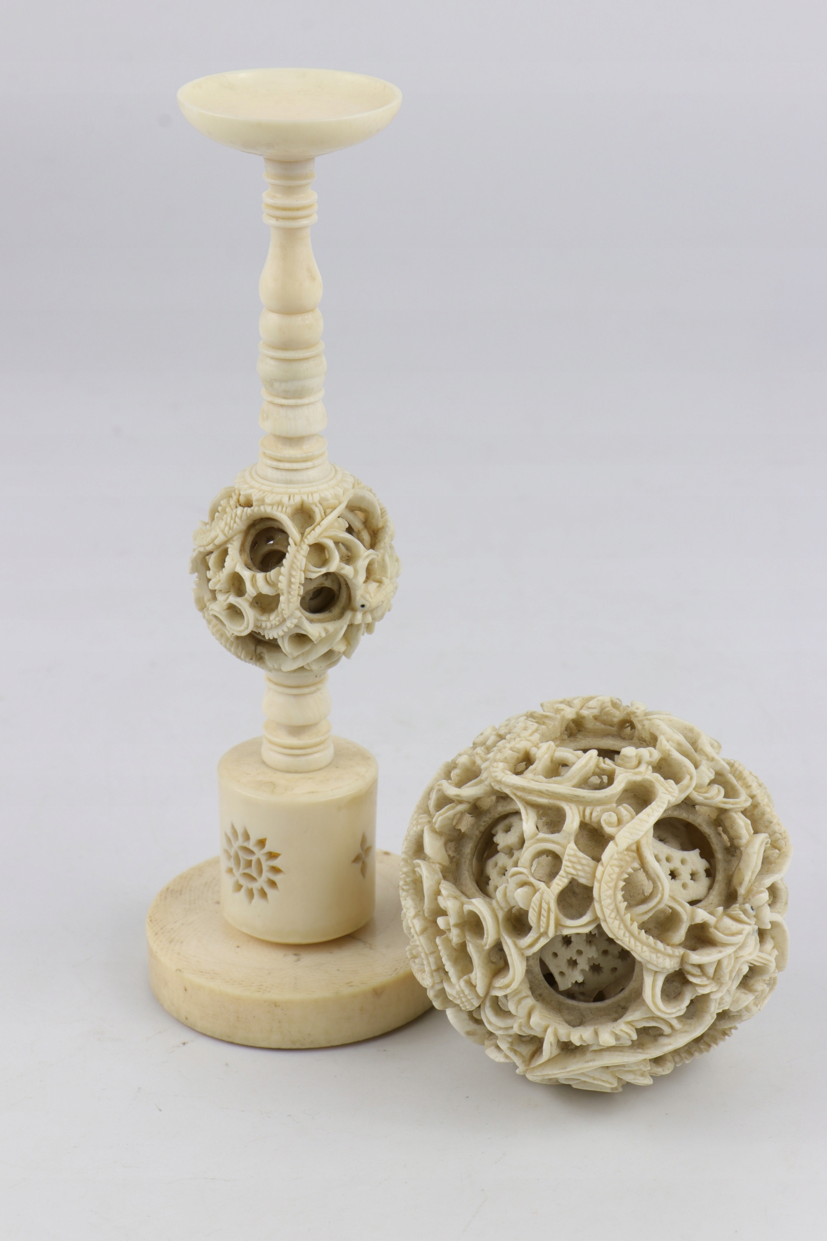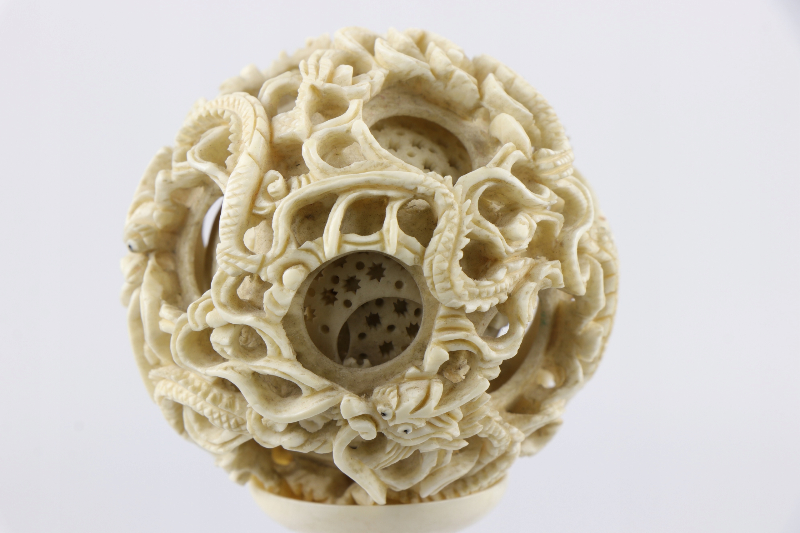 Интересный резной китайский шар на подставке. В украшении большего шара изображены два извивающихся дракона. Шар в основании имеет пять резных внутренних сфер, больший шар - с шестью внутренними сферами (первая внутренняя сфера повреждена). Красивая, очень точная скульптура.