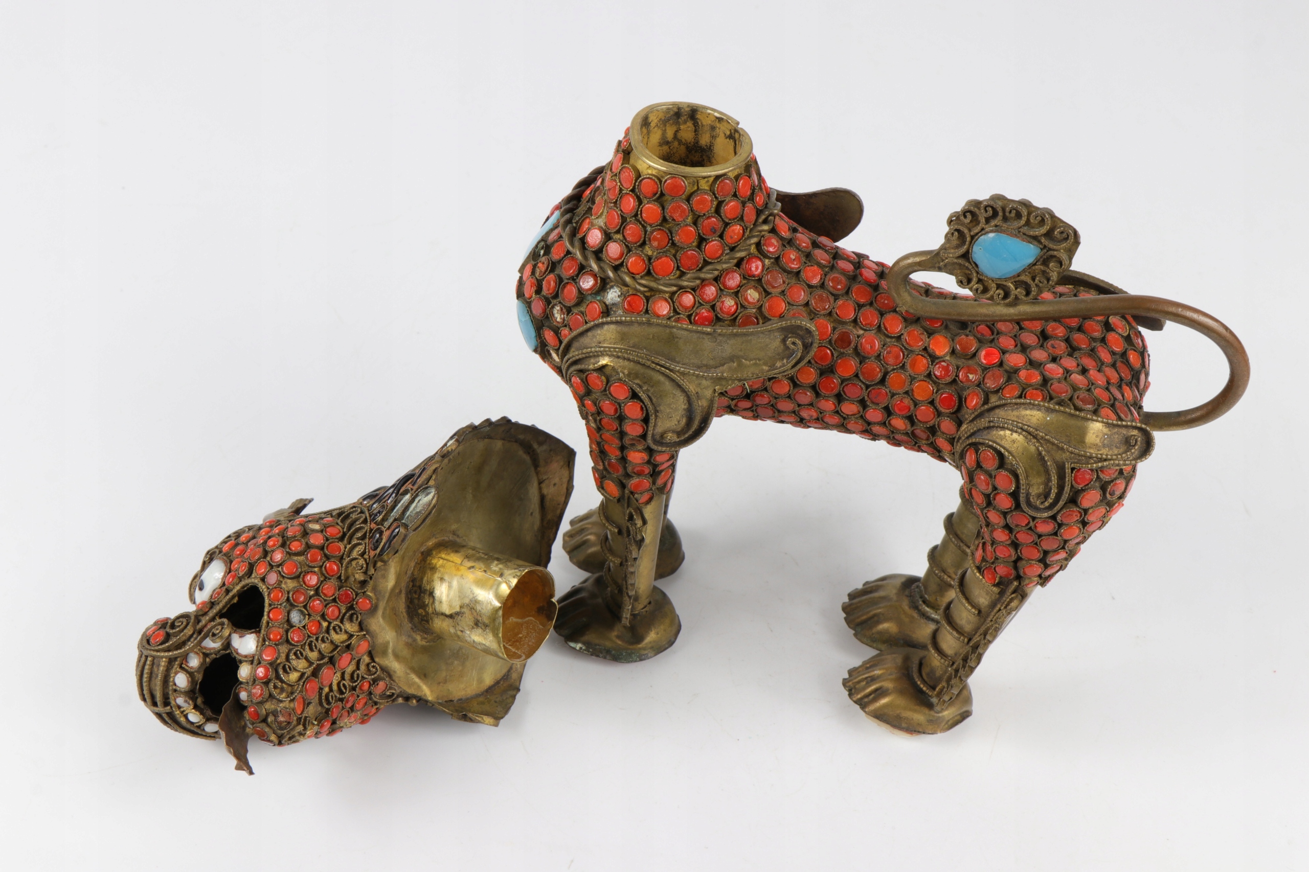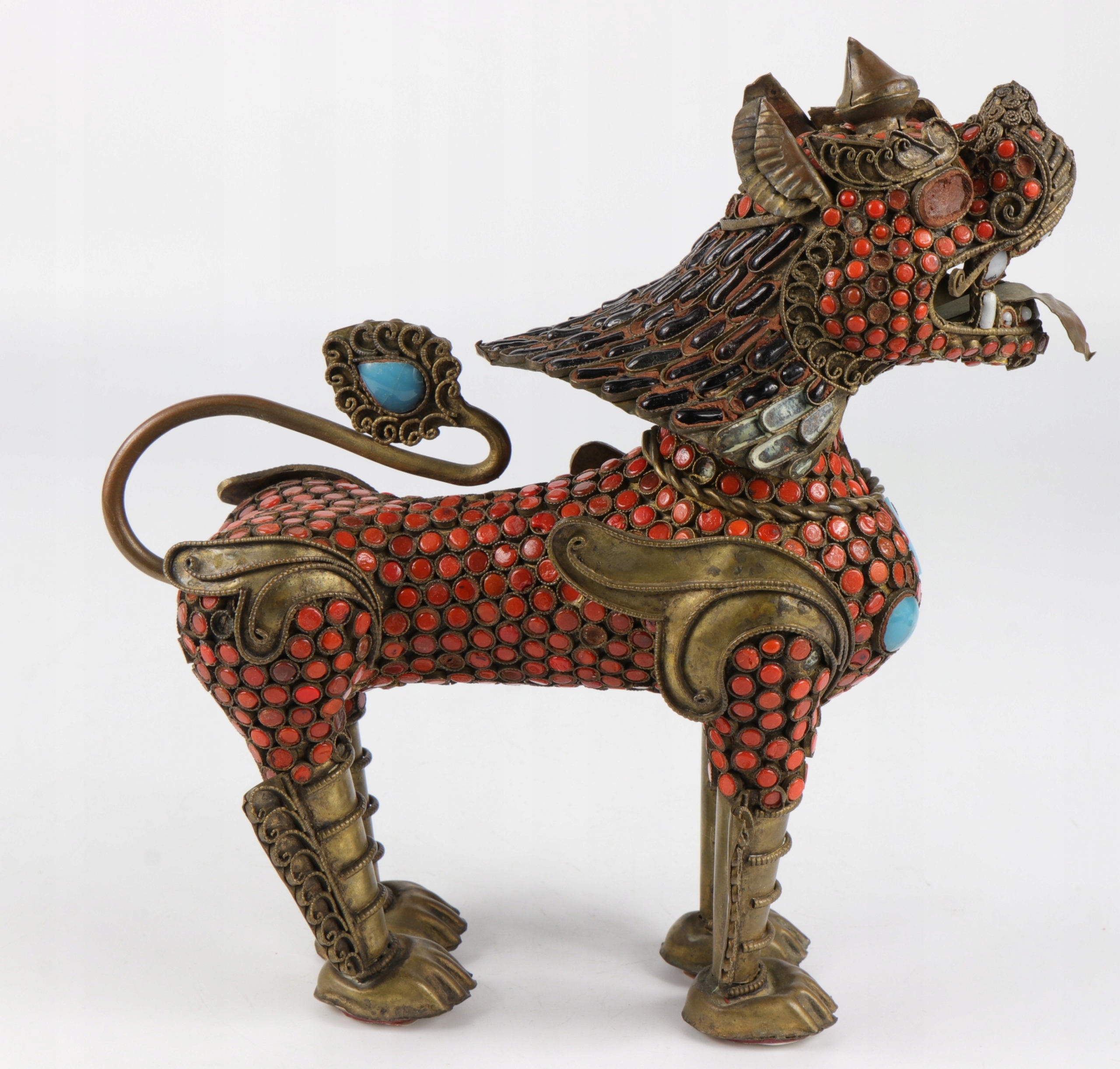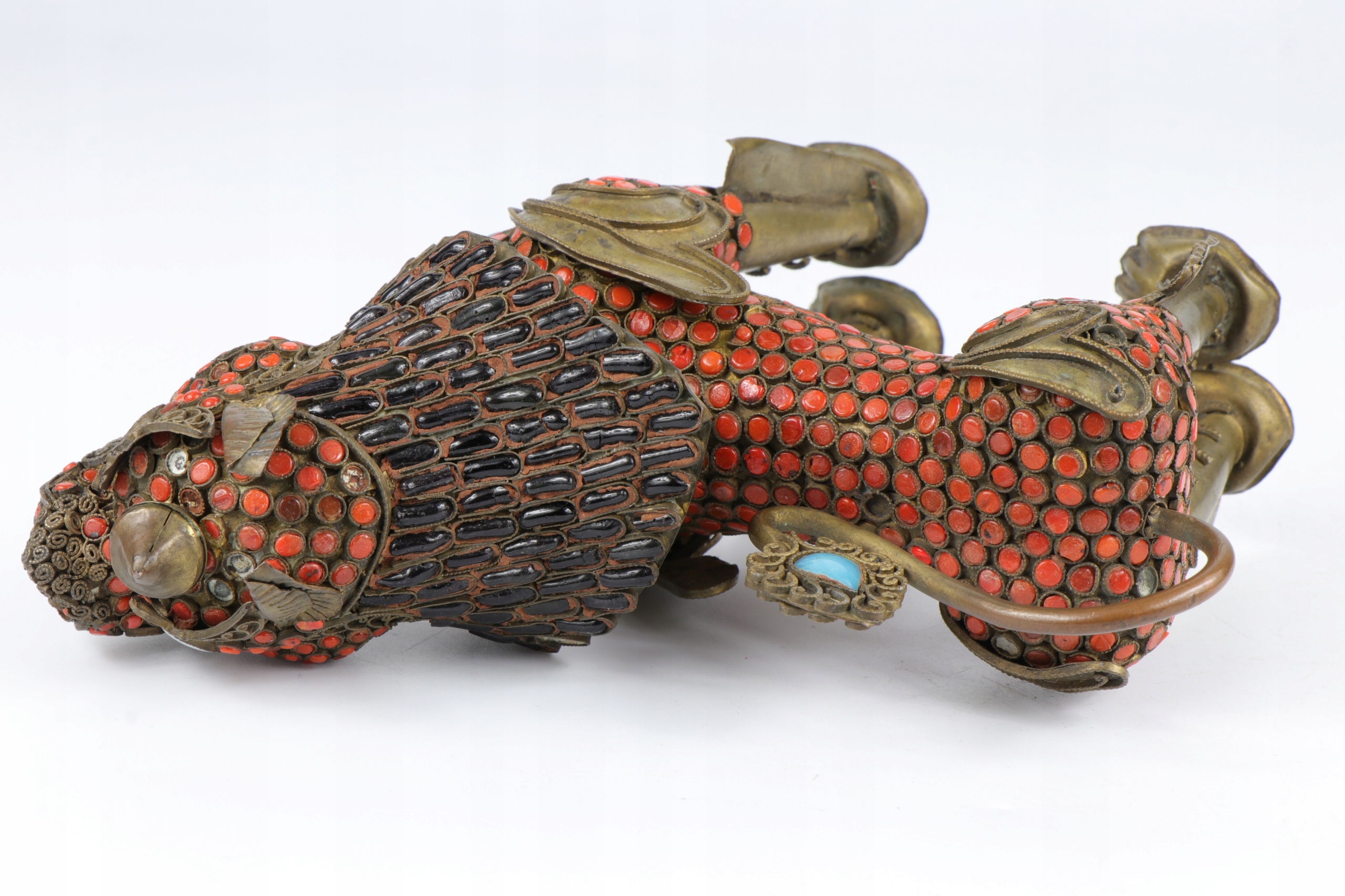 Китайская тибетская латунная скульптура, изображающая так называемую собаку Фу или снежного льва. Статуэтка инкрустирована бирюзой, нефритом, ониксом и кораллом. Он родом из первой половины 20 века. Как видно на фотографиях, голова подвижна и вставлена в тело, возможно, это небольшая курильница.