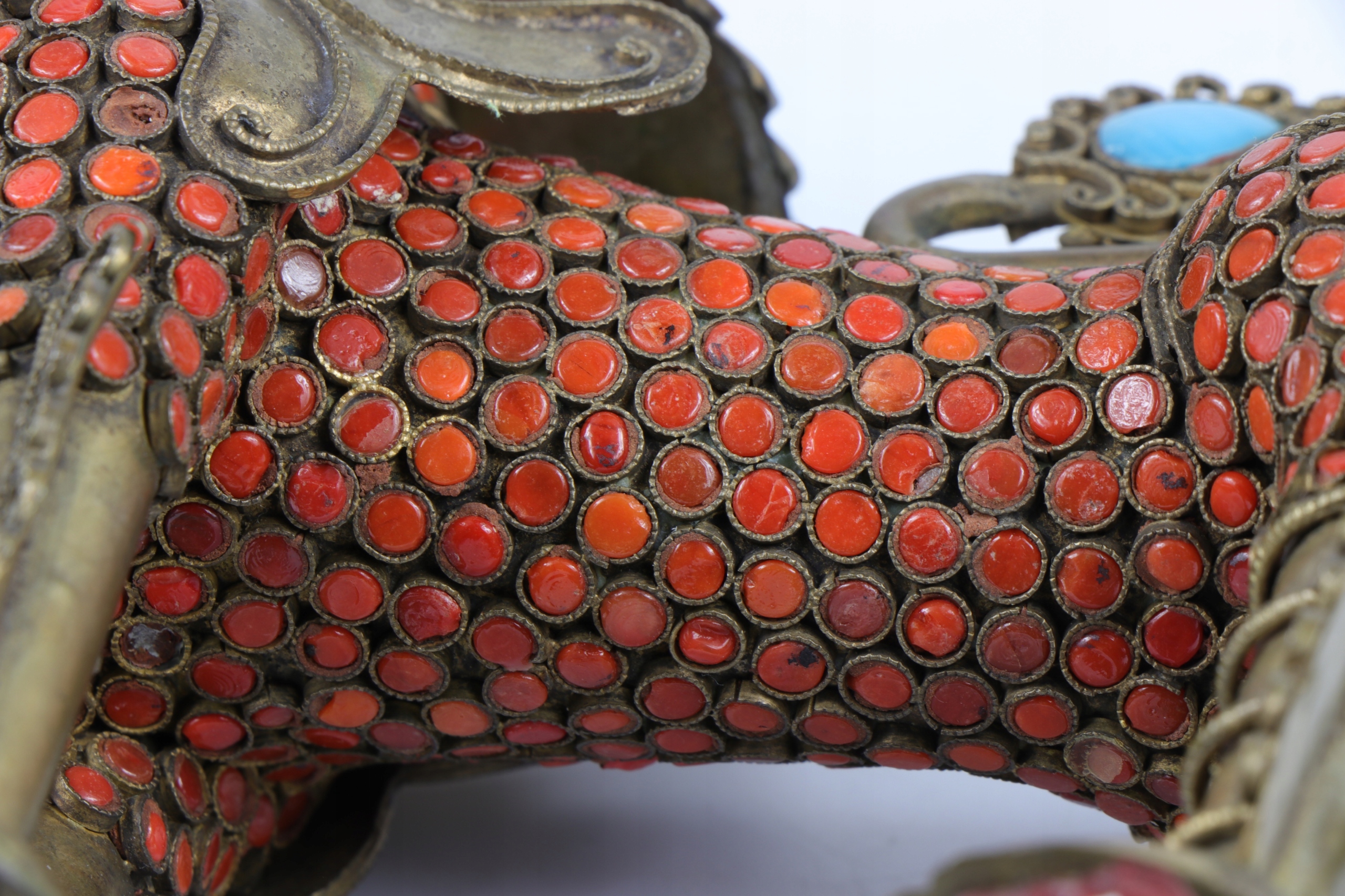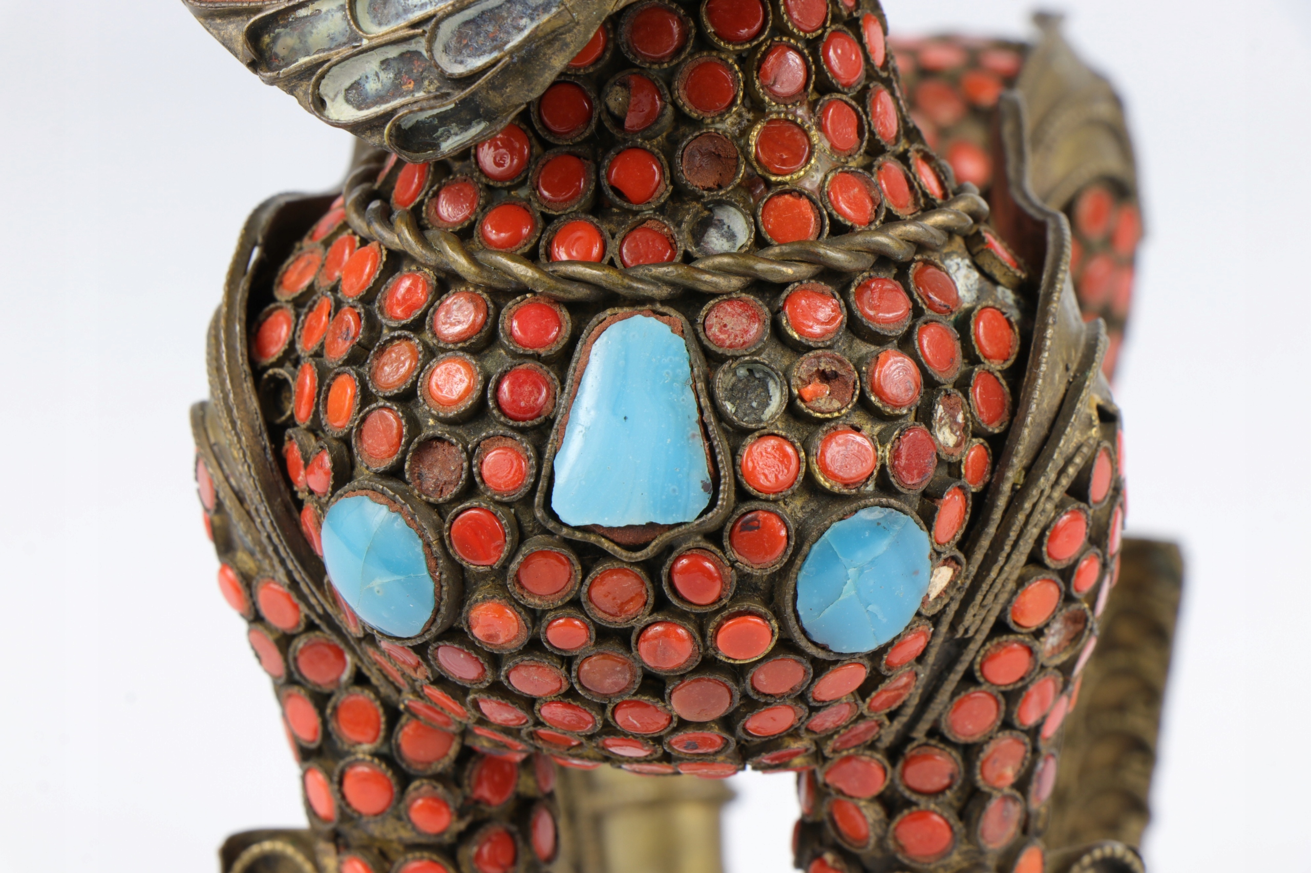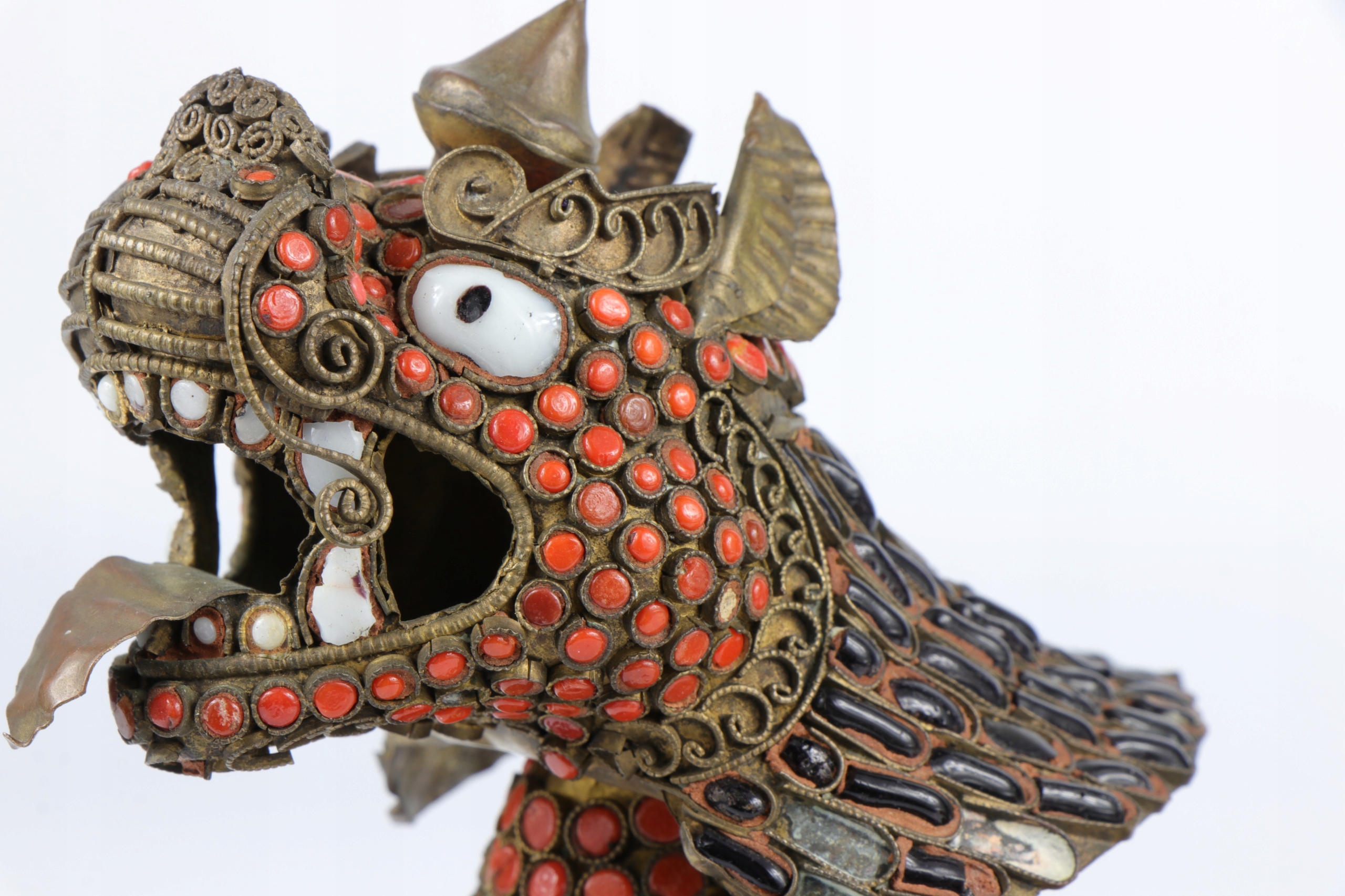 Китайская тибетская латунная скульптура, изображающая так называемую собаку Фу или снежного льва. Статуэтка инкрустирована бирюзой, нефритом, ониксом и кораллом. Он родом из первой половины 20 века. Как видно на фотографиях, голова подвижна и вставлена в тело, возможно, это небольшая курильница.