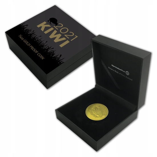 Золотой экземпляр 2021 года изготовлен из чистых слитков 999 пробы, весом одна 1/4 унции и диаметром 26 мм и номиналом 10$. Этот уникальный предмет произведен компанией BH Mayer's Kunstprageanstalt GmbH по заказу Почты Новой Зеландии. При этом Киви 2021 выпущен ограниченным тиражом всего в 500 штук и, что немаловажно, каждая штука поставляется в элегантном футляре.
