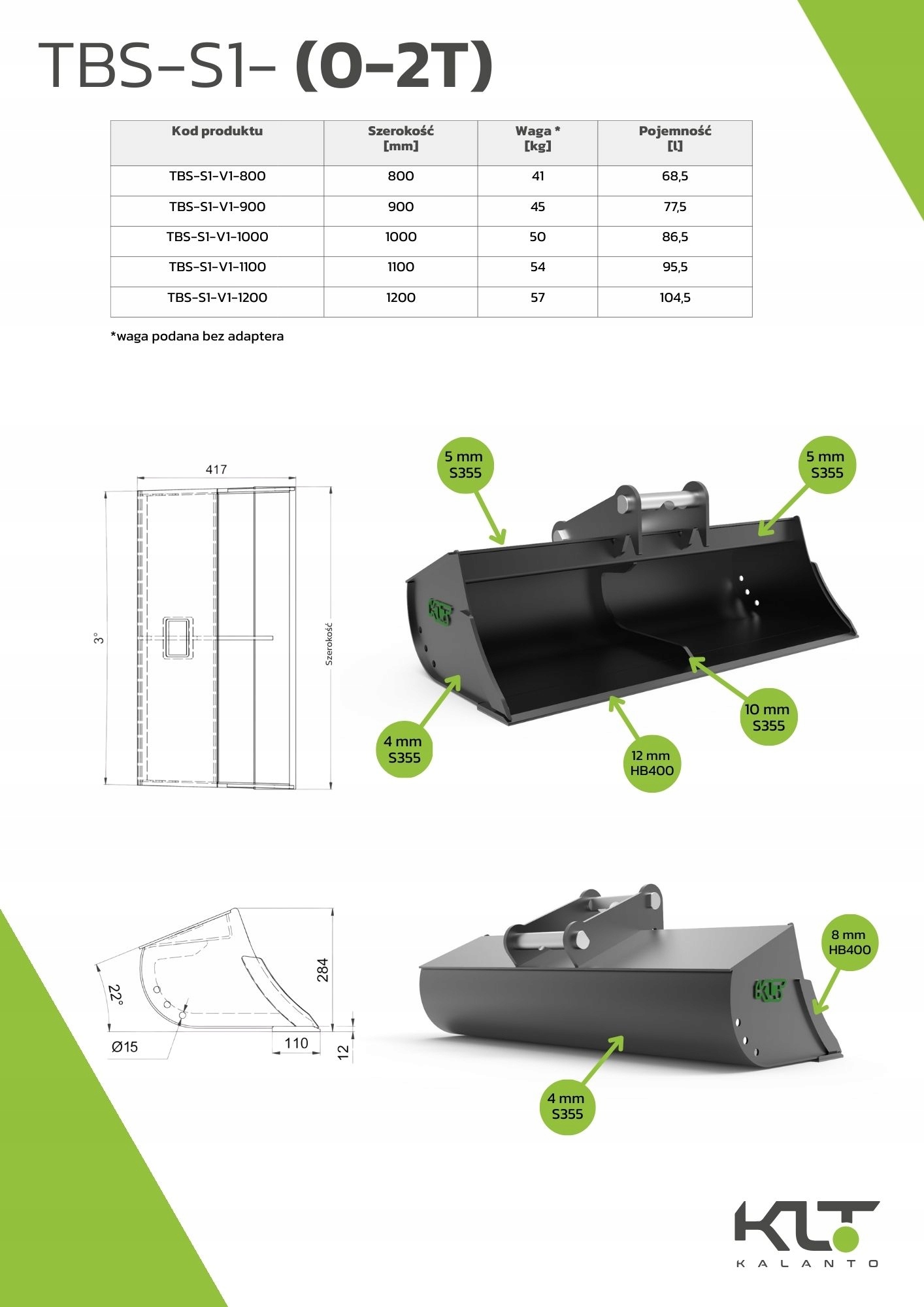 Модель TBS-S1 — легкий и прочный грейдерный ковш, предназначенный для мини-экскаваторов массой от 0 до 2 тонн. Созданный для точного профилирования местности, он идеально подходит для формирования склонов, выравнивания поверхностей, очистки канав и работ по очистке труднодоступных мест. Благодаря широкой чаше и соответствующей геометрии TBS-S1 обеспечивает равномерное распределение материала и эстетичный вид поверхности. Конструкция на основе стали с повышенной износостойкостью обеспечивает длительный срок службы ковша при сохранении небольшого собственного веса, что приводит к улучшению управляемости машины и снижению расхода топлива.