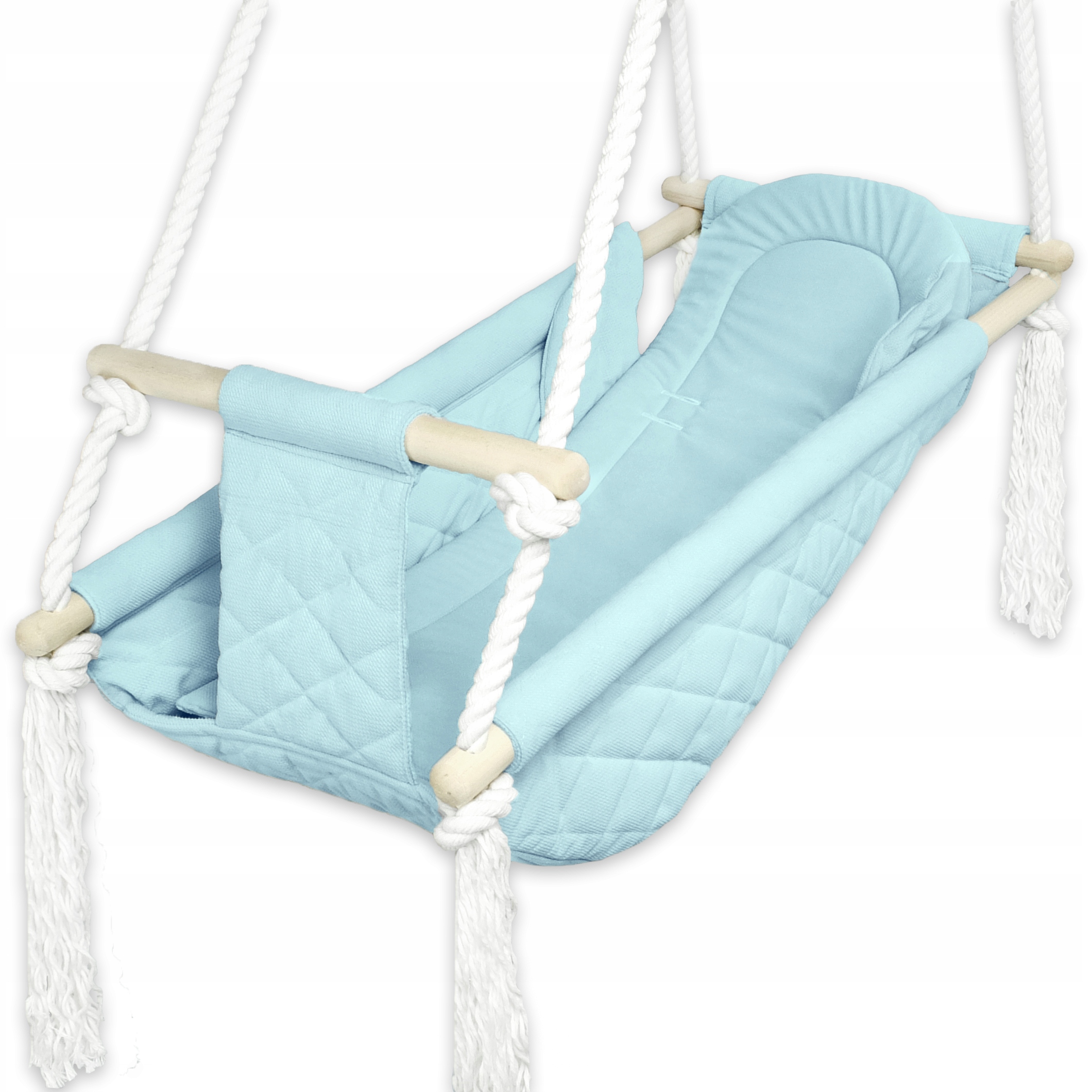 Колыбелька сделана из прочных, полированных прутьев и прочных хлопчатобумажных веревок. Сиденье и жесткая вставка изготовлены из ткани Бархат высочайшего качества.