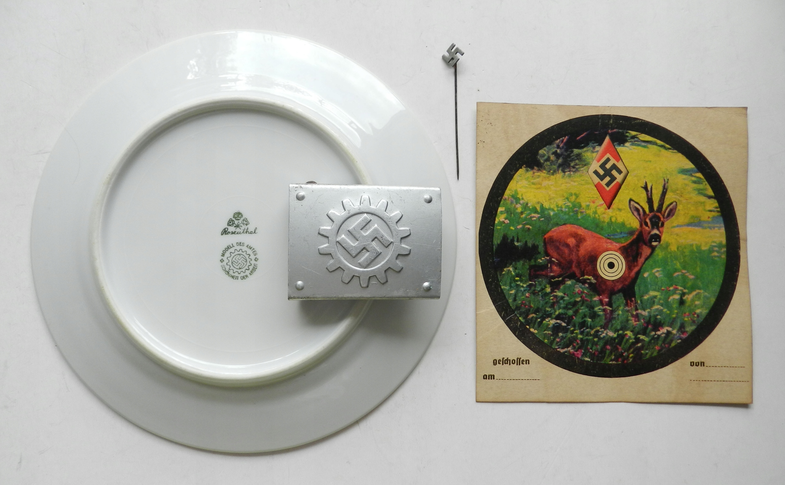 Предмет аукциона — оригинальная пряжка основного ремня DAF. Deutsche Arbeitsfront (DAF, Немецкий трудовой фронт) — немецкая организация, действующая под руководством НСДАП. Изготовлен из алюминия, вилки из никелированной стали. Производитель M4/44: Paul Cramer & Co, Люденшайд. Пряжка в отличном состоянии, аверс почти полностью в оригинальном серебряном лаке, реверс не лакирован, из-за чего алюминий немного подвержен коррозии. Рекомендую, отличная вещь.