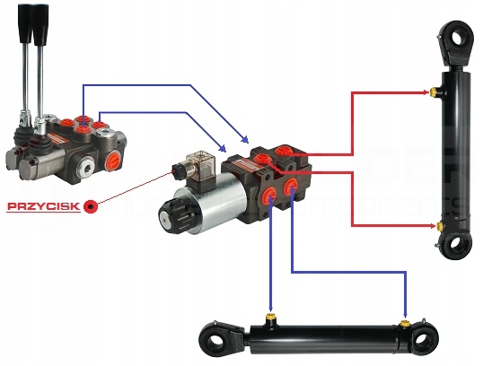 Электромагнитный клапан с помощью электрического импульса (12В) позволяет переключать управление между двумя независимо работающими приводами двойного действия. Это идеальное решение, когда у нас есть гидрораспределитель, в котором уже задействованы все имеющиеся секции, и вдруг возникла необходимость управления новым, дополнительным приводом.