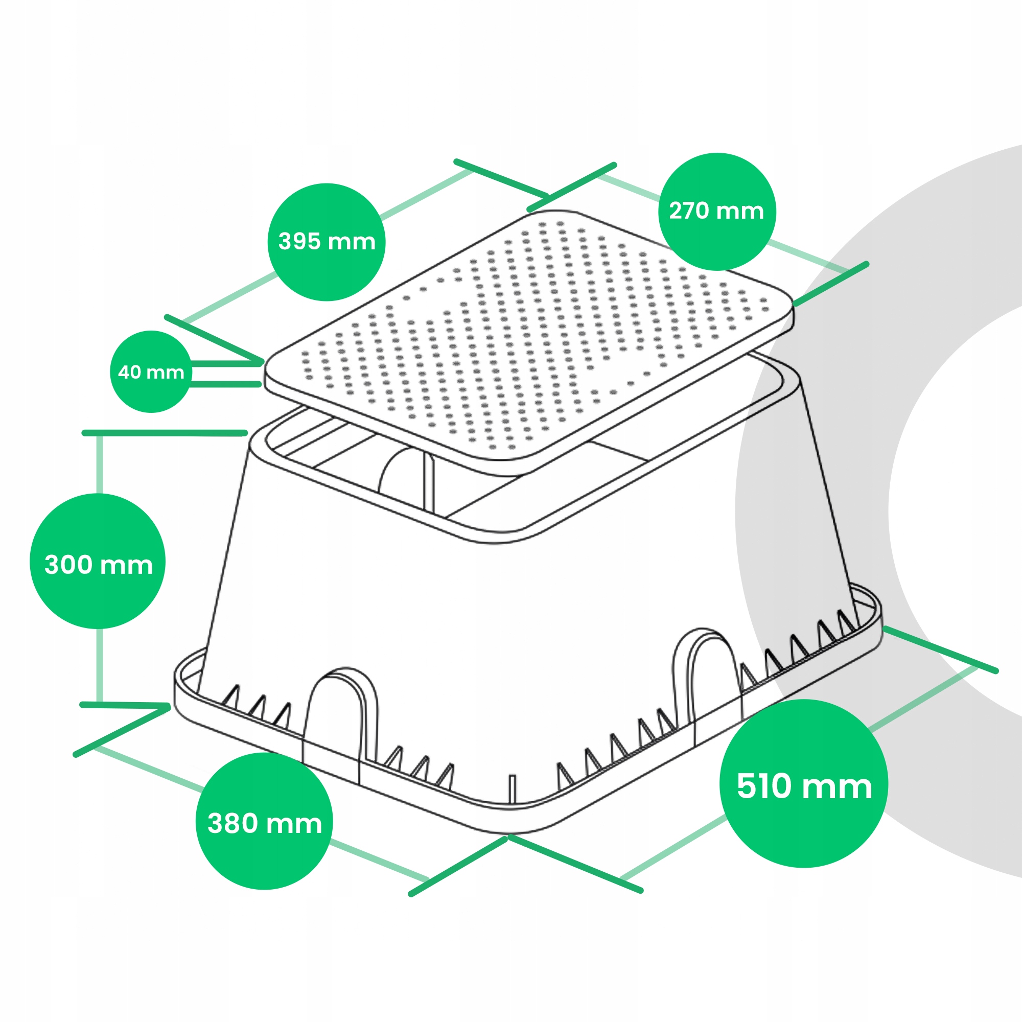 <ул> <ли> Размеры: 51 x 38 см. <ли> Высота: 310 мм <ли> Размеры крышки: 270x400 мм <ли> Размеры основания: 510x380 мм <ли> Материал: Полипропилен <ли> Цель: Монтаж и защита устройств оросительной системы <ли> Область применения: Оросительные системы <ли> Цвет: черный/зеленый <ли> montaz_pod_ziemia: ДаНомер продукта: SE080115007