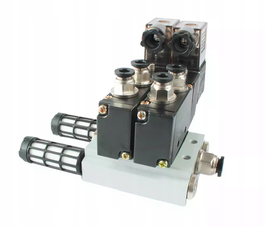 Пневматический клапанный остров, состоящий из 2 электромагнитных клапанов с функцией 5/2, с катушкой 24 В постоянного тока и вилкой со светодиодом и пневматическими аксессуарами.