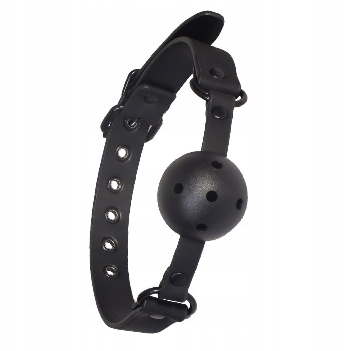 Дышащий кляп от Blaze. Гладкий пластиковый шарик (4,7 см) не имеет вкуса и запаха и достаточно велик, чтобы в него поместился кляп, не вызывая дискомфорта. Кляп удобен в ношении благодаря отверстиям для дыхания. Ремешок изготовлен из материала, напоминающего кожу, полностью регулируется с помощью металлической пряжки.