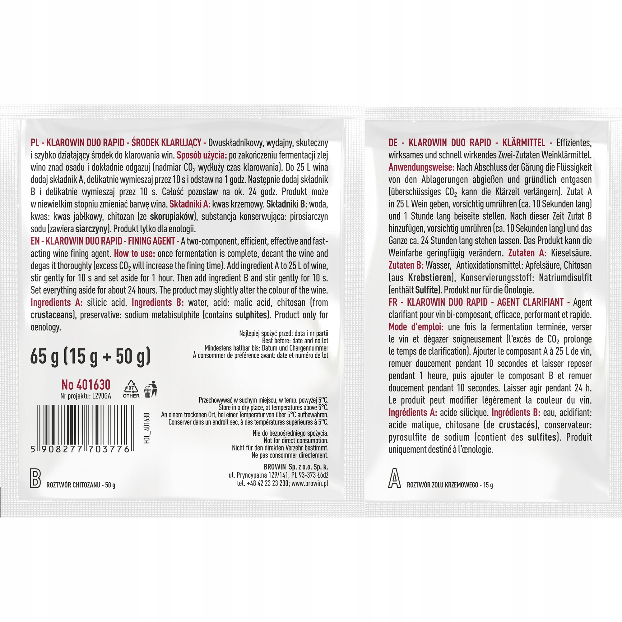 Двухкомпонентный осветлитель вина. В состав набора входят компонент А - кизельзол (раствор кремнезема), отрицательно заряженный, и компонент Б - раствор хитозана, положительно заряженный, обладающий широким хелатирующим действием. Он осаждает дубильные вещества (-), белки (+) и ионы металлов (+). Средство эффективное, действенное и быстродействующее. Пакета хватает на 25 литров воды. Предназначен для всех типов вин.