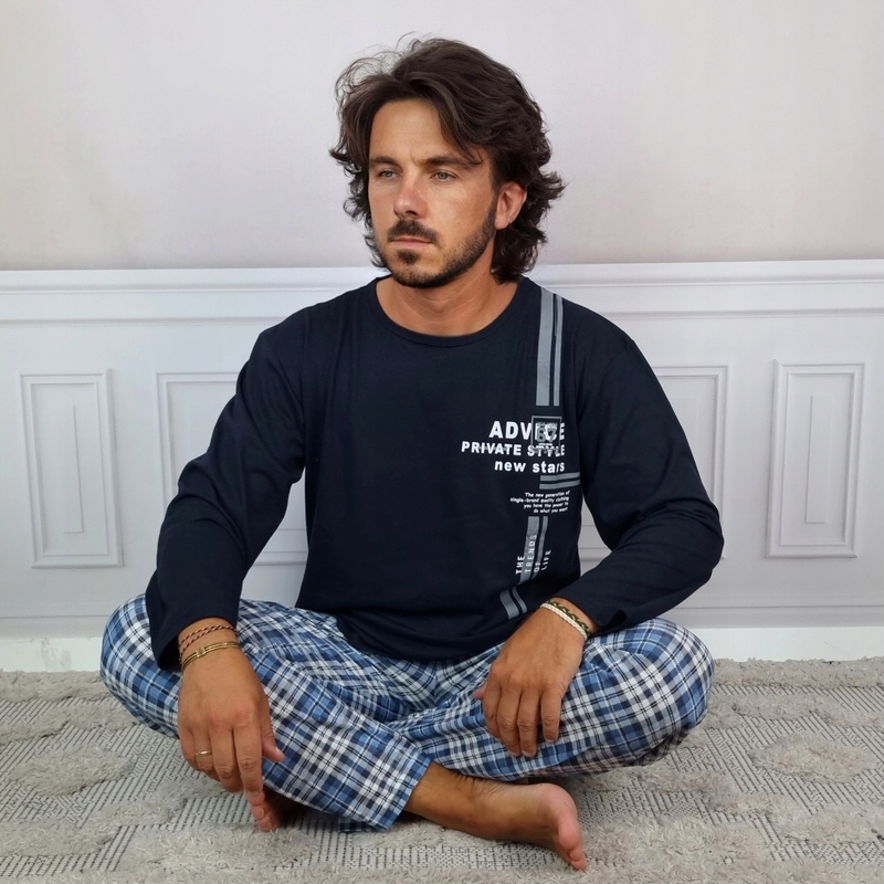 Мужская пижама-двойка - модель ADVICE представляет собой спальный комплект, состоящий из классической блузки с длинными рукавами и круглый вырез и длинные брюки. Вся вещь изготовлена из хлопка, приятного на ощупь и позволяющего коже дышать. В верхней части блузки небольшой принт. Недавящая шнуровка на талии делает брюки чрезвычайно удобными и универсальными. Спальный комплект также с успехом можно использовать как спортивный костюм или домашнюю одежду.