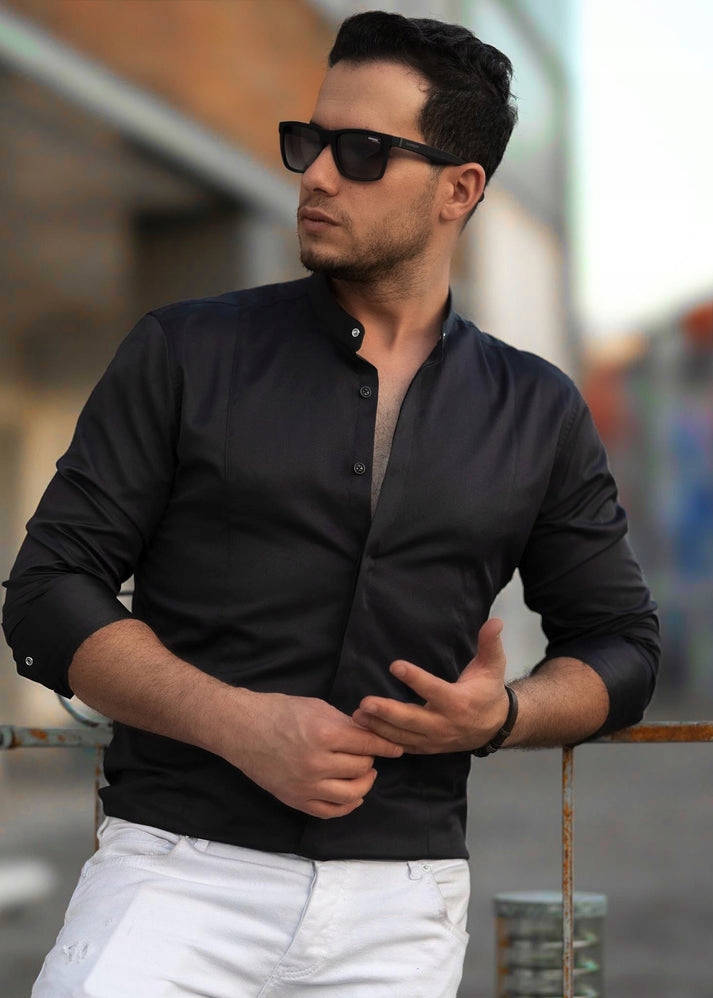 - элегантная гладкая рубашка с воротником-стойкой